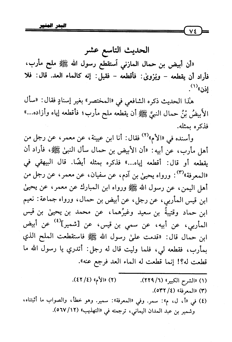 وأسنده فِي «الْأُم» فَقَالَ: أَنا ابْن عُيَيْنَة، عَن معمر، عَن رجل من أهل مأرب، عَن أَبِيه: «أَن الْأَبْيَض بن حمال سَأَلَ النبىَّ (، فَأَرَادَ أَن يقطعهُ أَو قَالَ: أقطعه إِيَّاه ... » فَذكره بِمثلِهِ أَيْضا. قَالَ الْبَيْهَقِيّ فِي «الْمعرفَة» : وَرَوَاهُ يَحْيَى بن آدم، عَن سُفْيَان، عَن معمر، عَن رجل من أهل الْيمن، عَن رَسُول الله - صَلَّى الله عَلَيْهِ وَسلم - وَرَوَاهُ ابْن الْمُبَارك عَن معمر، عَن يَحْيَى بن قيس المأربي، عَن رجل، عَن أَبيض بن حمال، وَرَوَاهُ جمَاعَة: نعيم بن حَمَّاد وقتيبةُ بن سعيد وغيرُهما، عَن مُحَمَّد بن يَحْيَى بن قيس المأربي، عَن أَبِيه، عَن سمي بن قيس، عَن [شمير] عَن أَبيض بن حمال قَالَ: «قدمت عَلَى رَسُول الله - صَلَّى الله عَلَيْهِ وَسلم - فاستقطعت الْملح الَّذِي بمأرب، فَقَطعه لي، فَلَمَّا وليت قَالَ لَهُ رجل: أَتَدْرِي يَا رَسُول الله مَا قطعت لَهُ؟ ! إِنَّمَا قطعت لَهُ المَاء الْعد فَرجع عَنهُ» .
