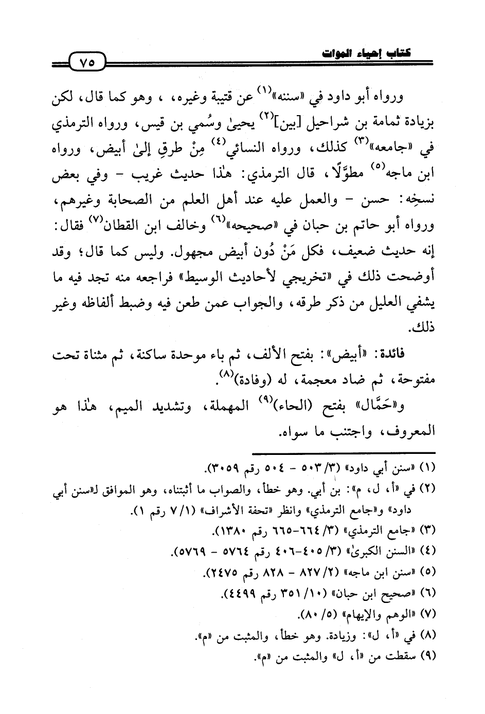 وَرَوَاهُ أَبُو دَاوُد فِي «سنَنه» عَن قُتَيْبَة وَغَيره،، وَهُوَ كَمَا قَالَ، لَكِن بِزِيَادَة ثُمَامَة بن شرَاحِيل [بَين] يَحْيَى وسُمي بن قيس، وَرَوَاهُ التِّرْمِذِيّ فِي «جَامعه» كَذَلِك، وَرَوَاهُ النَّسَائِيّ مِنْ طرقِ إِلَى أَبيض، وَرَوَاهُ ابْن مَاجَه مطوَّلاً، قَالَ التِّرْمِذِيّ: هَذَا حَدِيث غَرِيب - وَفِي بعض نسخِه: حسن - وَالْعَمَل عَلَيْهِ عِنْد أهل الْعلم من الصَّحَابَة وَغَيرهم، وَرَوَاهُ أَبُو حَاتِم بن حبَان فِي «صَحِيحه» وَخَالف ابْن الْقطَّان فَقَالَ: إِنَّه حَدِيث ضَعِيف، فَكل مَنْ دُون أَبيض مَجْهُول. وَلَيْسَ كَمَا قَالَ؛ وَقد أوضحت ذَلِك فِي «تخريجي لأحاديث الْوَسِيط» فَرَاجعه مِنْهُ تَجِد فِيهِ مَا يشفي العليل من ذكر طرقه، وَالْجَوَاب عَمَّن طعن فِيهِ وَضبط أَلْفَاظه وَغير ذَلِك.