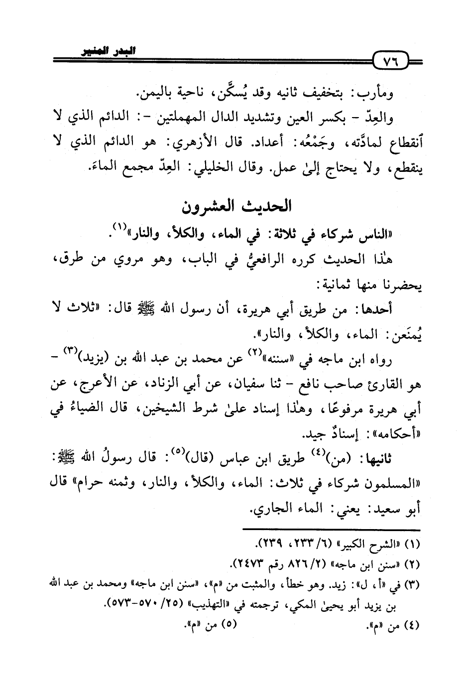 ثَانِيهَا: (من) طَرِيق ابْن عَبَّاس (قَالَ) : قَالَ رَسُول الله - صَلَّى الله عَلَيْهِ وَسلم -: «الْمُسلمُونَ شُرَكَاء فِي ثَلَاث: المَاء، والكلأ، وَالنَّار، وثمنه حرَام» قَالَ أَبُو سعيد: يَعْنِي: المَاء الْجَارِي.
