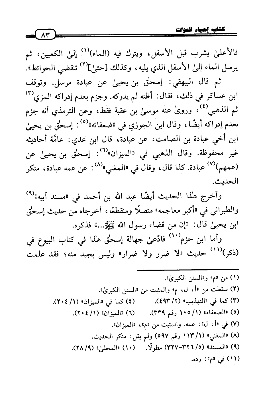 ثمَّ قَالَ الْبَيْهَقِيّ: إِسْحَاق بن يَحْيَى عَن عبَادَة مُرْسل. وَتوقف ابْن عَسَاكِر فِي ذَلِك، فَقَالَ: أَظُنهُ لم يُدْرِكهُ. وَجزم بِعَدَمِ إِدْرَاكه الْمزي ثمَّ الذَّهَبِيّ، وَرَوَى عَنهُ مُوسَى بن عقبَة فَقَط، وَعَن التِّرْمِذِيّ أَنه جزم بِعَدَمِ إِدْرَاكه أَيْضا، وَقَالَ ابْن الْجَوْزِيّ فِي «ضُعَفَائِهِ» : إِسْحَاق بن يَحْيَى ابْن أخي عبَادَة بن الصَّامِت، عَن عبَادَة، قَالَ ابْن عدي: عامَّة أَحَادِيثه غير مَحْفُوظَة. وَقَالَ الذَّهَبِيّ فِي «الْمِيزَان» : إِسْحَاق بن يَحْيَى عَن (عمهم) عبَادَة. كَذَا قَالَ، وَقَالَ فِي «الْمُغنِي» : عَن عَمه عبَادَة، مُنكر الحَدِيث.
