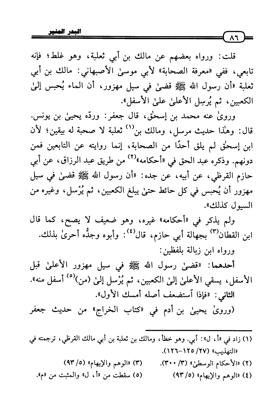وَرَوَى عَنهُ مُحَمَّد بن إِسْحَاق، قَالَ جَعْفَر: وردّه يَحْيَى بن يُونُس. قَالَ: وَهَذَا حَدِيث مُرْسل، وَمَالك بن ثَعْلَبَة لَا صُحْبَة لَهُ بِيَقِين؛ لِأَن ابْن إِسْحَاق لم يلق أحدا من الصَّحَابَة، إِنَّمَا رِوَايَته عَن التَّابِعين فَمن دونهم. وَذكره عبد الْحق فِي «أَحْكَامه» من طَرِيق عبد الرَّزَّاق، عَن أبي حَازِم الْقرظِيّ، عَن أَبِيه، عَن جده: «أَن رَسُول الله - صَلَّى الله عَلَيْهِ وَسلم - قَضَى فِي سيل مهزور أَن يُحبس فِي كل حَائِط حَتَّى يبلغ الْكَعْبَيْنِ، ثمَّ يُرْسل، وَغَيره من السُّيُول كَذَلِك» .