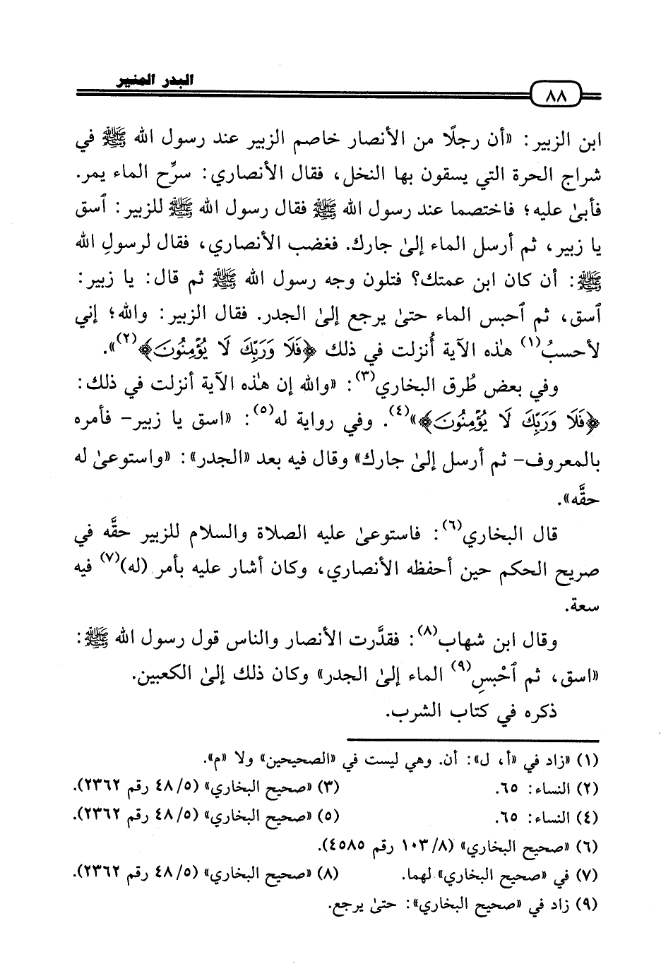 بن الزبير: «أَن رجلا من الْأَنْصَار خَاصم الزبير عِنْد رَسُول الله - صَلَّى الله عَلَيْهِ وَسلم - فِي شراج الْحرَّة الَّتِي يسقون بهَا النّخل، فَقَالَ الْأنْصَارِيّ: سرِّح المَاء يمر. فَأَبَى عَلَيْهِ؛ فاختصما عِنْد رَسُول الله - صَلَّى الله عَلَيْهِ وَسلم - فَقَالَ رَسُول الله - صَلَّى الله عَلَيْهِ وَسلم - للزبير: اسْقِ يَا زبير، ثمَّ أرسل المَاء إِلَى جَارك. فَغَضب الْأنْصَارِيّ، فَقَالَ لرَسُول الله - صَلَّى الله عَلَيْهِ وَسلم -: أَن كَانَ ابْن عَمَّتك؟ فَتَلَوَّنَ وَجه رَسُول الله - صَلَّى الله عَلَيْهِ وَسلم - ثمَّ قَالَ: يَا زبير: اسْقِ، ثمَّ احْبِسْ المَاء حَتَّى يرجع إِلَى الْجدر. فَقَالَ الزبير: وَالله؛ إِنِّي لأحسبُ هَذِه الْآيَة أُنزلت فِي ذَلِك (فَلَا وَرَبك لَا يُؤمنُونَ» .