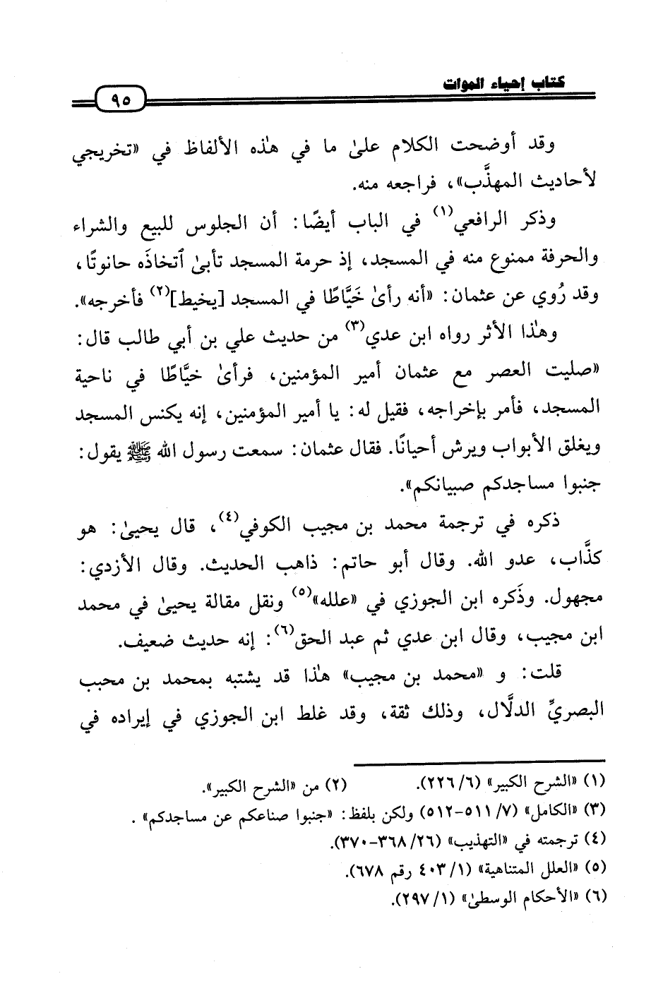 وَهَذَا الْأَثر رَوَاهُ ابْن عدي من حَدِيث عَلّي بن أبي طَالب قَالَ: «صليت الْعَصْر مَعَ عُثْمَان أَمِير الْمُؤمنِينَ، فَرَأَى خيَّاطًا فِي نَاحيَة الْمَسْجِد، فَأمر بِإِخْرَاجِهِ، فَقيل لَهُ: يَا أَمِير الْمُؤمنِينَ، إِنَّه يكنس الْمَسْجِد ويغلق الْأَبْوَاب ويرش أَحْيَانًا. فَقَالَ عُثْمَان: سَمِعت رَسُول الله - صَلَّى الله عَلَيْهِ وَسلم - يَقُول: جَنبُوا مَسَاجِدكُمْ صِبْيَانكُمْ» .
