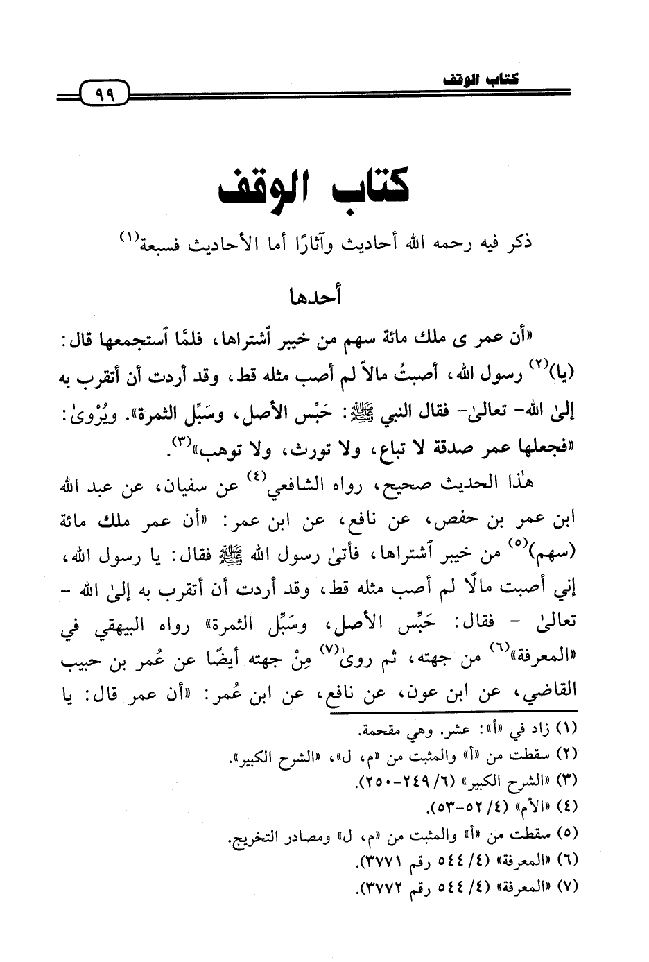 هَذَا الحَدِيث صَحِيح، رَوَاهُ الشَّافِعِي عَن سُفْيَان، عَن عبد الله بن عمر بن حَفْص، عَن نَافِع، عَن ابْن عمر: «أَن عمر ملك مائَة (سهم) من خَيْبَر اشْتَرَاهَا، فَأَتَى رَسُول الله - صَلَّى الله عَلَيْهِ وَسلم - فَقَالَ: يَا رَسُول الله، إِنِّي أصبت مَالا لم أصب مثله قطّ، وَقد أردْت أَن أَتَقَرَّب بِهِ إِلَى اللهِ - تَعَالَى - فَقَالَ: حَبِّس الأَصْل، وسَبِّل الثَّمَرَة» رَوَاهُ الْبَيْهَقِيّ فِي «الْمعرفَة) من جِهَته، ثمَّ رَوَى مِنْ جِهَته أَيْضا عَن عُمر بن حبيب القَاضِي، عَن ابْن عون، عَن نَافِع، عَن ابْن عُمر: «أَن عمر قَالَ: يَا
