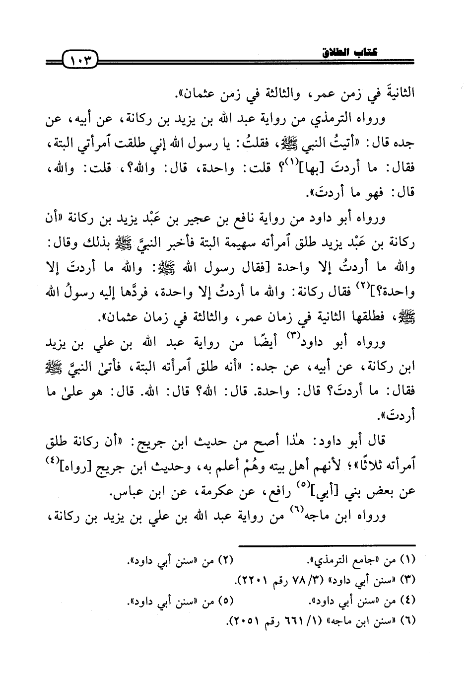 وَرَوَاهُ أَبُو دَاوُد من رِوَايَة نَافِع بن عجير بن عَبْد يزِيد بن ركَانَة «أَن ركَانَة بن عَبْد يزِيد طلق امْرَأَته سهيمة الْبَتَّةَ فَأخْبر النَّبِي - صَلَّى الله عَلَيْهِ وَسلم - بذلك وَقَالَ: واللَّهِ مَا أردْت إِلَّا وَاحِدَة [فَقَالَ رَسُول الله - صَلَّى الله عَلَيْهِ وَسلم -: وَالله مَا أردْت إِلَّا وَاحِدَة؟] فَقَالَ ركَانَة: واللَّهِ مَا أردتُ إِلَّا وَاحِدَة، فردَّها إِلَيْهِ رَسُول الله - صَلَّى الله عَلَيْهِ وَسلم -، فَطلقهَا الثَّانِيَة فِي زمَان عمر، وَالثَّالِثَة فِي زمَان عُثْمَان» .