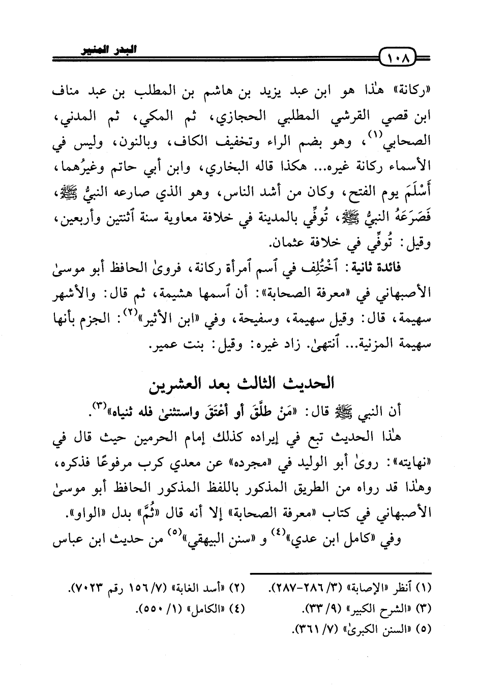 فَائِدَة ثَانِيَة: اخْتُلِف فِي اسْم امْرَأَة ركَانَة، فروَى الْحَافِظ أَبُو مُوسَى الْأَصْبَهَانِيّ فِي «معرفَة الصَّحَابَة» : أَن اسْمهَا هشيمة، ثمَّ قَالَ: وَالْأَشْهر سهيمة، قَالَ: وَقيل سهيمة، وسفيحة، وَفَى «ابْن الْأَثِير» : الْجَزْم بِأَنَّهَا سهيمة المزنية ... انْتَهَى. زَاد غَيره: وَقيل: بنت عُمَيْر.