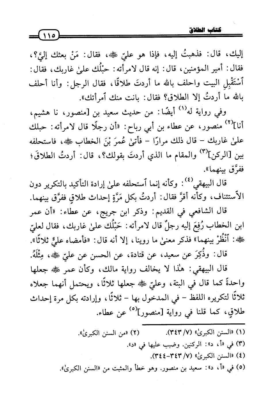 وَفَى رِوَايَة لَهُ أَيْضا: من حَدِيث سعيد بن [مَنْصُور، نَا هشيم، أَنا] مَنْصُور، عَن عَطاء بن أبي رَبَاح: «أَن رجلا قَالَ لامْرَأَته: حبلك عَلَى غاربك - قَالَ ذَلِك مرَارًا - فَأَتَى عُمرَ بْنَ الْخطاب رَضِيَ اللَّهُ عَنْه، فاستحلفه بَين [الرُّكْن] وَالْمقَام مَا الذى أردتَ بِقَوْلِك؟ ، قَالَ: أردتُ الطلاقَ؛ ففرَّق بَينهمَا» .