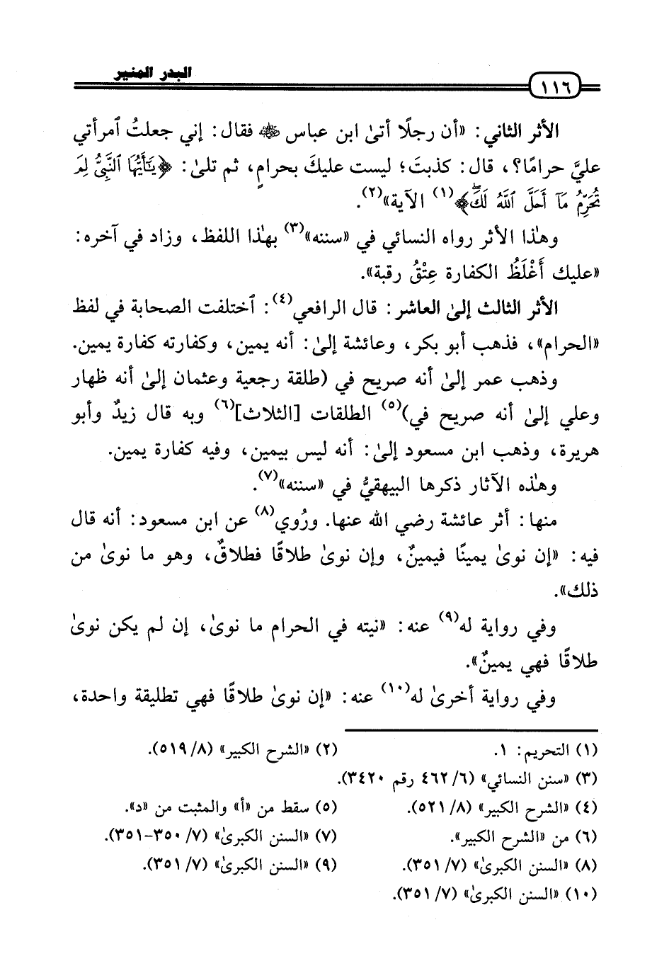 الْأَثر الثَّالِث إِلَى الْعَاشِر: قَالَ الرَّافِعِيّ: اخْتلفت الصَّحَابَة فِي لفظ «الْحَرَام» ، فَذهب أَبُو بكر، وَعَائِشَة إِلَى: أَنه يَمِين، وكفارته كَفَّارَة يَمِين.