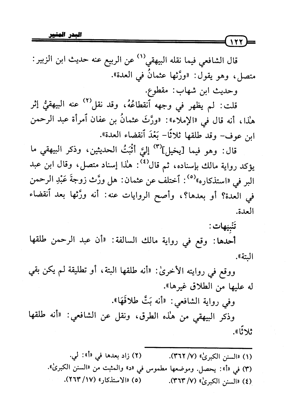 قلت: لم يظْهر فِي وَجهه انقطاعُهُ، وَقد نقل عَنهُ البيهقيُّ إِثْر هَذَا، أَنه قَالَ فِي «الْإِمْلَاء» : «ورَّثَ عثمانُ بن عَفَّان امْرَأَة عبد الرَّحْمَن بن عَوْف - وَقد طَلقهَا ثَلَاثًا - بَعْدَ انْقِضَاء الْعدة» .