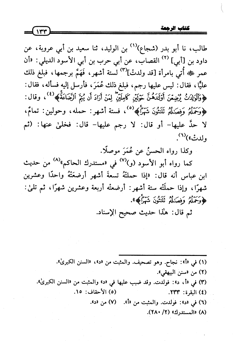 طَالب، نَا أَبُو بدر (شُجَاع) بن الْوَلِيد، ثَنَا سعيد بن أبي عرُوبَة، عَن دَاوُد بن [أبي] القصاب، عَن أبي حَرْب بن أبي الْأسود الديلِي: «أَن عمر رَضِيَ اللَّهُ عَنْه أُتي بِامْرَأَة [قد ولدتْ] لسِتَّة أشهر، فَهَمَّ برجمها، فَبلغ ذَلِك عليًَّا، فَقَالَ: لَيْسَ عَلَيْهَا رجم، فَبلغ ذَلِك عُمَرَ، فَأرْسل إِلَيْهِ فَسَأَلَهُ، فَقَالَ: (والوالدات يرضعن أَوْلَادهنَّ حَوْلَيْنِ كَامِلين لمَنْ أَرَادَ أَن يتم الرضَاعَة) ، وَقَالَ: (وَحمله وفصاله ثَلَاثُونَ شهرا) ، فستة أشهر: حمله، وحولين: تمامٌ، لَا حدَّ عَلَيْهَا - أَو قَالَ: لَا رجم عَلَيْهَا - قَالَ: فخلى عَنْهَا: (ثمَّ ولدتْ» .