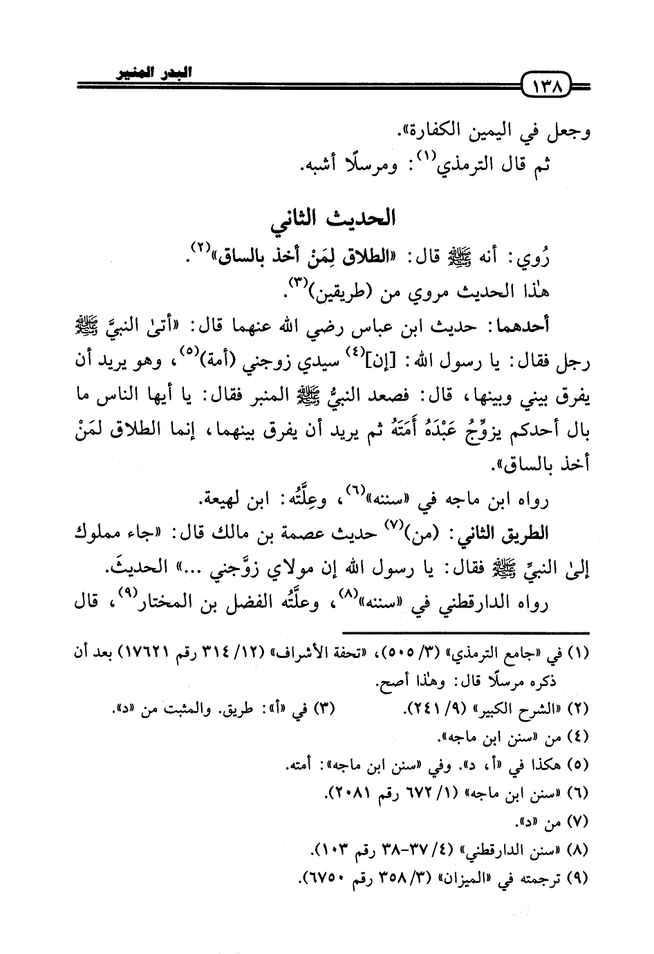 أَحدهمَا: حَدِيث ابْن عَبَّاس رَضِيَ اللَّهُ عَنْهما قَالَ: «أَتَى النَّبِي - صَلَّى الله عَلَيْهِ وَسلم - رجل فَقَالَ: يَا رَسُول الله: [إِن] سَيِّدي زَوجنِي (أمة) ، وَهُوَ يُرِيد أَن يفرق بيني وَبَينهَا، قَالَ: فَصَعدَ النَّبِي - صَلَّى الله عَلَيْهِ وَسلم - الْمِنْبَر فَقَالَ: يَا أَيهَا النَّاس مَا بَال أحدكُم يزوِّجُ عَبْدَهُ أَمَتَهُ ثمَّ يُرِيد أَن يفرق بَينهمَا، إِنَّمَا الطَّلَاق لمَنْ أَخذ بالساق» .