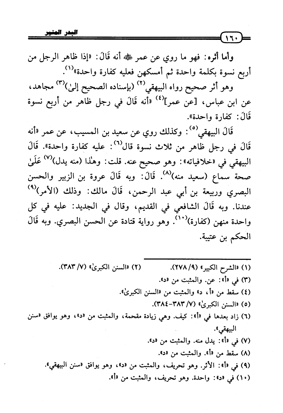 قَالَ الْبَيْهَقِيّ: وَكَذَلِكَ رُوِيَ عَن سعيد بن الْمسيب، عَن عمر «أَنه قَالَ فِي رجل ظَاهر من ثَلَاث نسْوَة قَالَ: عَلَيْهِ كَفَّارَة وَاحِدَة» . قَالَ الْبَيْهَقِيّ فِي «خلافياته» : وَهُوَ صَحِيح عَنهُ. قلت: وَهَذَا (مِنْهُ يدل) عَلَى صِحَة سَماع (سعيد مِنْهُ) . قَالَ: وَبِه قَالَ عُرْوَة بن الزبير وَالْحسن الْبَصْرِيّ وَرَبِيعَة بن أبي عبد الرَّحْمَن، قَالَ مَالك: وَذَلِكَ (الْأَمر) عندنَا. وَبِه قَالَ الشَّافِعِي فِي الْقَدِيم، وَقَالَ فِي الْجَدِيد: عَلَيْهِ فِي كل وَاحِدَة مِنْهُنَّ (كَفَّارَة) . وَهُوَ رِوَايَة قَتَادَة عَن الْحسن الْبَصْرِيّ. وَبِه قَالَ الحكم بن عتيبة.