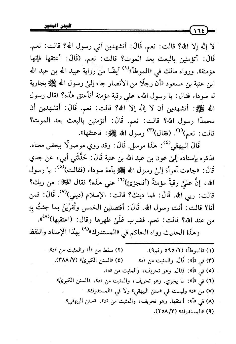 لَا إِلَه إِلَّا الله؟ قَالَت: نعم. قَالَ: أتشهدين أَنِّي رَسُول الله؟ قَالَت: نعم. قَالَ: أتؤمنين بِالْبَعْثِ بعد الْمَوْت؟ قَالَت: نعم. (قَالَ: أعْتقهَا فَإِنَّهَا مُؤمنَة» . وَرَوَاهُ مَالك فِي «الْمُوَطَّأ» أَيْضا من رِوَايَة عبيد الله بن عبد الله بن عتبَة بن مَسْعُود «أَن رجلا من الْأَنْصَار جَاءَ إِلَى رَسُول الله - صَلَّى الله عَلَيْهِ وَسلم - بِجَارِيَة لَهُ سَوْدَاء فَقَالَ: يَا رَسُول الله، عَلّي رَقَبَة مُؤمنَة أفأعتق هَذِه؟ فَقَالَ رَسُول الله - صَلَّى الله عَلَيْهِ وَسلم -: أتشهدين أَن لَا إِلَه إِلَّا الله؟ قَالَت: نعم. قَالَ: أتشهدين أَن مُحَمَّدًا رَسُول الله؟ قَالَت: نعم. قَالَ: أتؤمنين بِالْبَعْثِ بعد الْمَوْت؟ قَالَت: نعم) . (فَقَالَ) رَسُول الله - صَلَّى الله عَلَيْهِ وَسلم -: فاعتقها» .