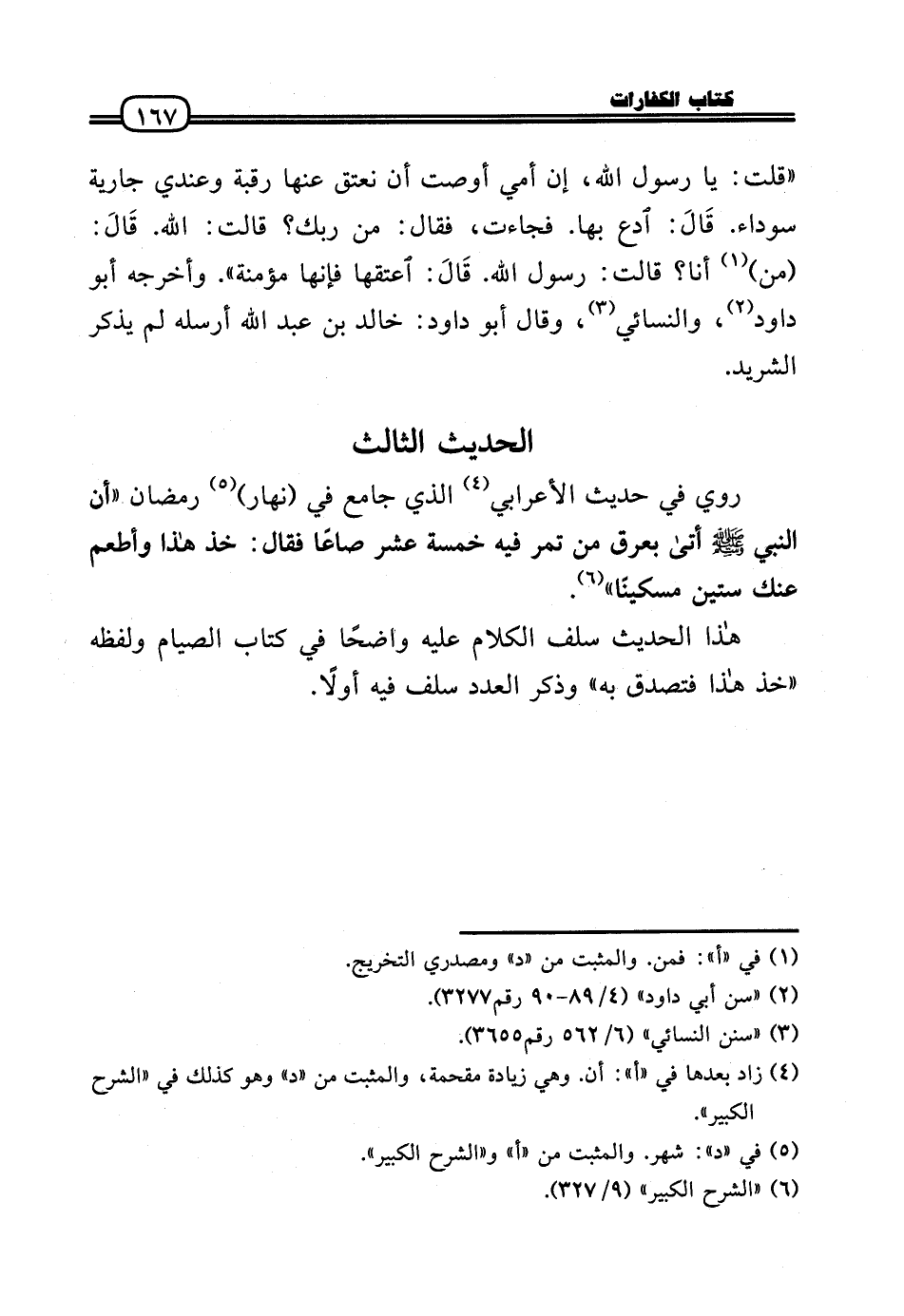 «قلت: يَا رَسُول الله، إِن أُمِّي أوصت أَن نعتق عَنْهَا رَقَبَة وَعِنْدِي جَارِيَة سَوْدَاء. قَالَ: ادْع بهَا. فَجَاءَت، فَقَالَ: من رَبك؟ قَالَت: الله. قَالَ: (من) أَنا؟ قَالَت: رَسُول الله. قَالَ: اعتقها فَإِنَّهَا مُؤمنَة» . وَأخرجه أَبُو دَاوُد، وَالنَّسَائِيّ، وَقَالَ أَبُو دَاوُد: خَالِد بن عبد الله أرْسلهُ لم يذكر الشريد.