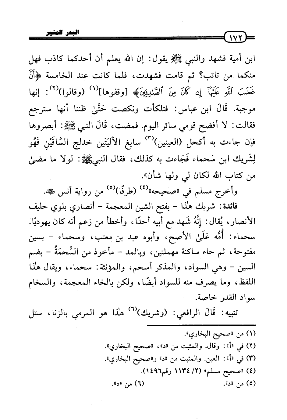بن أُميَّة فَشهد وَالنَّبِيّ - صَلَّى الله عَلَيْهِ وَسلم - يَقُول: إِن الله يعلم أَن أَحَدكُمَا كَاذِب فَهَل مِنْكُمَا من تائب؟ ثمَّ قَامَت فَشَهِدت، فَلَمَّا كَانَت عِنْد الْخَامِسَة (أَن غضب الله عَلَيْهَا إِن كَانَ من الصَّادِقين ( [وقفوها] (وَقَالُوا) : إِنَّهَا مُوجبَة. قَالَ ابْن عَبَّاس: فتلكأت وَنَكَصت حَتَّى ظننا أَنَّهَا سترجع فَقَالَت: لَا أفضح قومِي سَائِر الْيَوْم. فمضت، قَالَ النَّبِي - صَلَّى الله عَلَيْهِ وَسلم -: أبصروها فَإِن جَاءَت بِهِ أكحل (الْعَينَيْنِ) سابغ الأليتَيَن خَدلج السَّاقَيْنِ فَهُو لِشَريك ابْن سَحماء فَجَاءت بِهِ كَذَلِك، فَقَالَ النَّبِي - صَلَّى الله عَلَيْهِ وَسلم -: لَوْلَا مَا مَضَى من كتاب الله لَكَانَ لي وَلها شَأْن» .