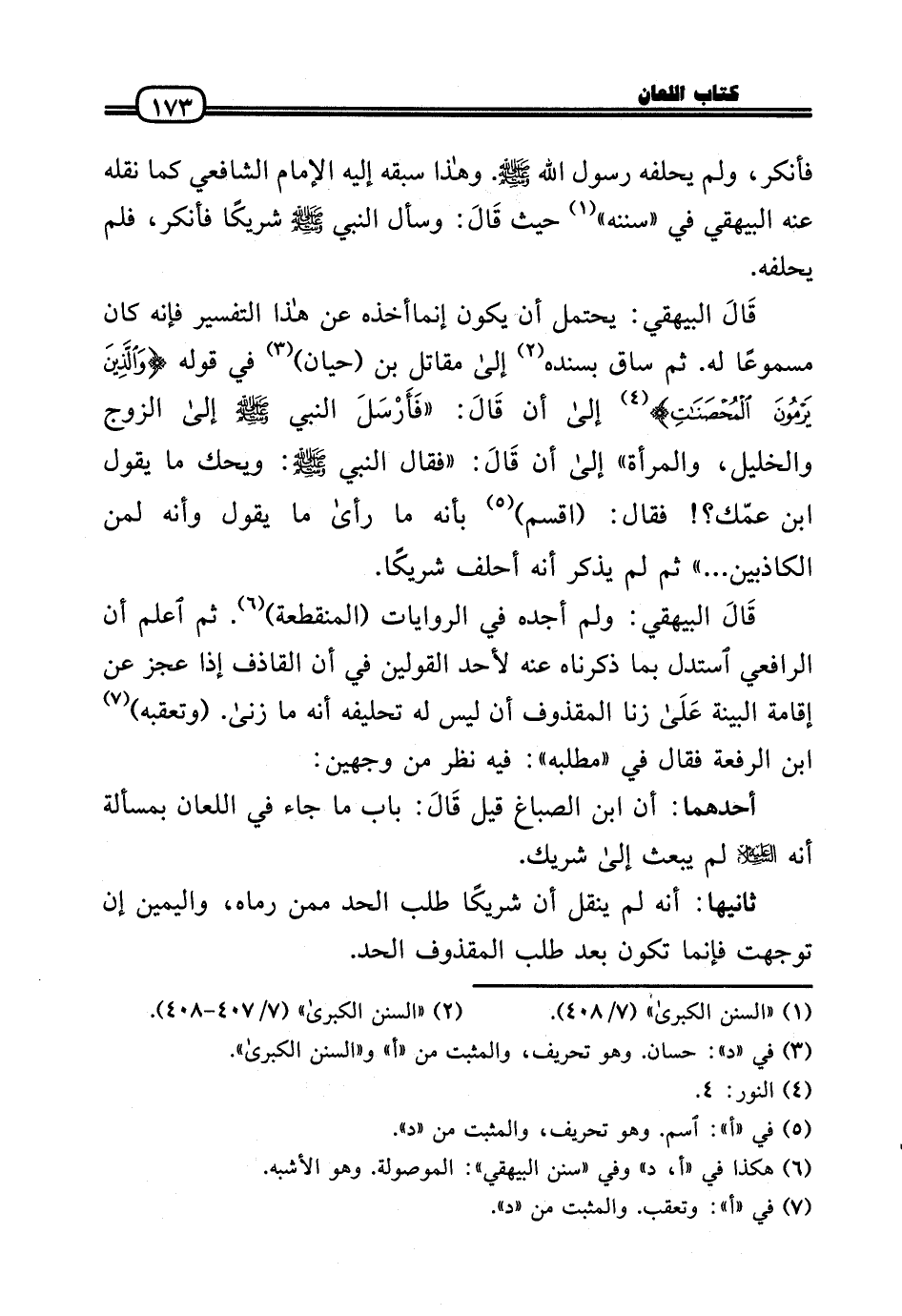 قَالَ الْبَيْهَقِيّ: يحْتَمل أَن يكون إنماأخذه عَن هَذَا التَّفْسِير فَإِنَّهُ كَانَ مسموعًا لَهُ. ثمَّ سَاق بِسَنَدِهِ إِلَى مقَاتل بن (حَيَّان) فِي قَوْله (وَالَّذين يرْمونَ الْمُحْصنَات) إِلَى أَن قَالَ: «فَأَرْسَلَ النَّبِي - صَلَّى الله عَلَيْهِ وَسلم - إِلَى الزَّوْج والخليل، وَالْمَرْأَة» إِلَى أَن قَالَ: «فَقَالَ النَّبِي - صَلَّى الله عَلَيْهِ وَسلم -: وَيحك مَا يَقُول ابْن عمّك؟ ! فَقَالَ: (اقْسمْ) بِأَنَّهُ مَا رَأَى مَا يَقُول وَأَنه لمن الْكَاذِبين ... » ثمَّ لم يذكر أَنه أَحْلف شَرِيكا.