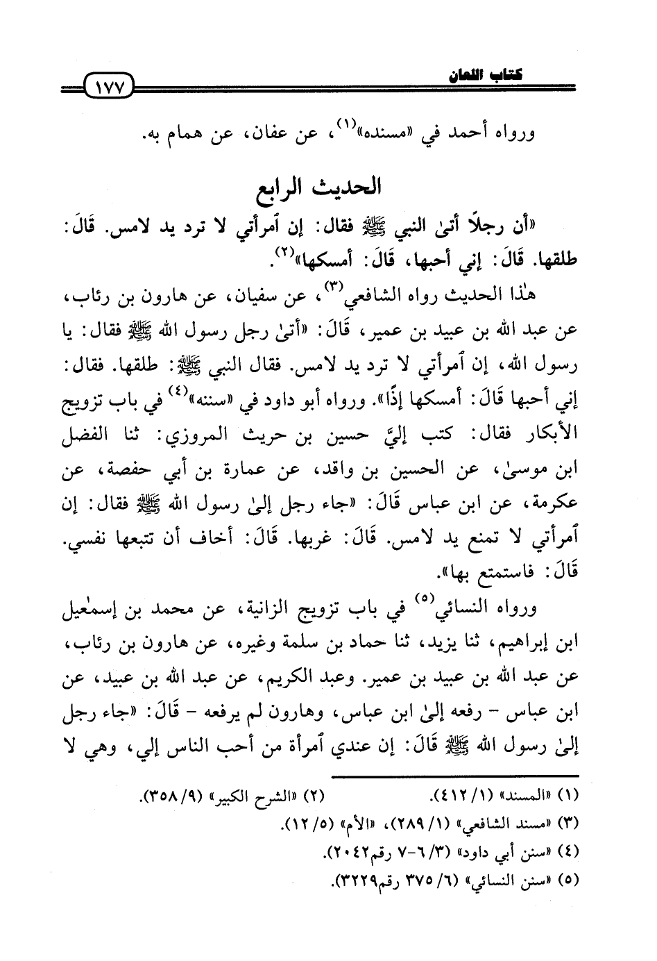 هَذَا الحَدِيث رَوَاهُ الشَّافِعِي، عَن سُفْيَان، عَن هَارُون بن رِئَاب، عَن عبد الله بن عبيد بن عُمَيْر، قَالَ: «أَتَى رجل رَسُول الله - صَلَّى الله عَلَيْهِ وَسلم - فَقَالَ: يَا رَسُول الله، إِن امْرَأَتي لَا ترد يَد لامس. فَقَالَ النَّبِي - صَلَّى الله عَلَيْهِ وَسلم -: طَلقهَا. فَقَالَ: إِنِّي أحبها قَالَ: أمْسكهَا إِذا» . وَرَوَاهُ أَبُو دَاوُد فِي «سنَنه» فِي بَاب تَزْوِيج الْأَبْكَار فَقَالَ: كتب إليَّ حُسَيْن بن حُرَيْث الْمروزِي: ثَنَا الْفضل بن مُوسَى، عَن الْحُسَيْن بن وَاقد، عَن عمَارَة بن أبي حَفْصَة، عَن عِكْرِمَة، عَن ابْن عَبَّاس قَالَ: «جَاءَ رجل إِلَى رَسُول الله - صَلَّى الله عَلَيْهِ وَسلم - فَقَالَ: إِن امْرَأَتي لَا تمنع يَد لامس. قَالَ: غربها. قَالَ: أَخَاف أَن تتبعها نَفسِي. قَالَ: فاستمتع بهَا» .
