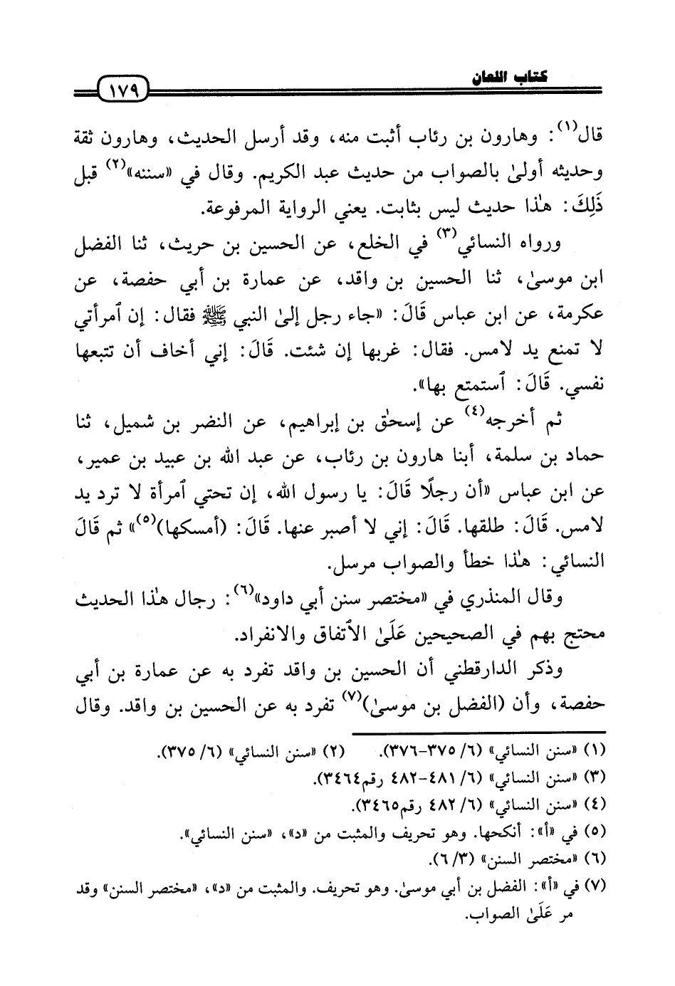 ثمَّ أخرجه عَن إِسْحَاق بن إِبْرَاهِيم، عَن النَّضر بن شُمَيْل، ثَنَا حَمَّاد بن سَلمَة، أبنا هَارُون بن رِئَاب، عَن عبد الله بن عبيد بن عُمَيْر، عَن ابْن عَبَّاس «أَن رجلا قَالَ: يَا رَسُول الله، إِن تحتي امْرَأَة لَا ترد يَد لامس. قَالَ: طَلقهَا. قَالَ: إِنِّي لَا أَصْبِر عَنْهَا. قَالَ: (أمْسكهَا)) ثمَّ قَالَ النَّسَائِيّ: هَذَا خطأ وَالصَّوَاب مُرْسل.