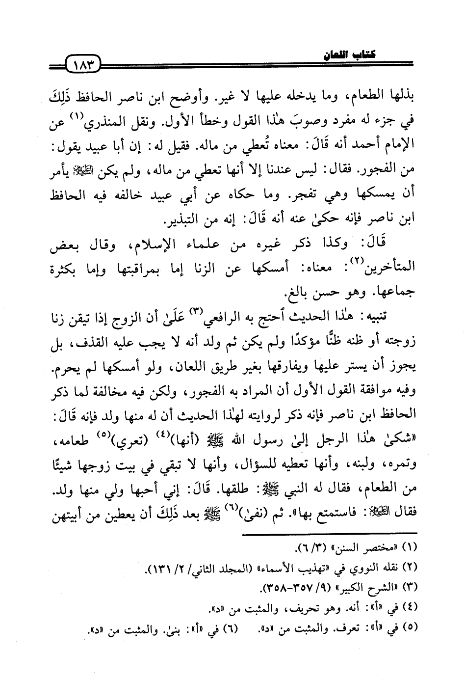 بذلها الطَّعَام، وَمَا يدْخلهُ عَلَيْهَا لَا غير. وأوضح ابْن نَاصِر الْحَافِظ ذَلِكَ فِي جُزْء لَهُ مُفْرد وصوبَ هَذَا القَوْل وَخطأ الأول. وَنقل الْمُنْذِرِيّ عَن الإِمَام أَحْمد أَنه قَالَ: مَعْنَاهُ تُعطي من مَاله. فَقيل لَهُ: إِن أَبَا عبيد يَقُول: من الْفُجُور. فَقَالَ: لَيْسَ عندنَا إِلَّا أَنَّهَا تُعْطِي من مَاله، وَلم يكن عَلَيْهِ السَّلَام يَأْمر أَن يمْسِكهَا وَهِي تفجر. وَمَا حَكَاهُ عَن أبي عبيد خَالفه فِيهِ الْحَافِظ ابْن نَاصِر فَإِنَّهُ حَكَى عَنهُ أَنه قَالَ: إِنَّه من التبذير.
