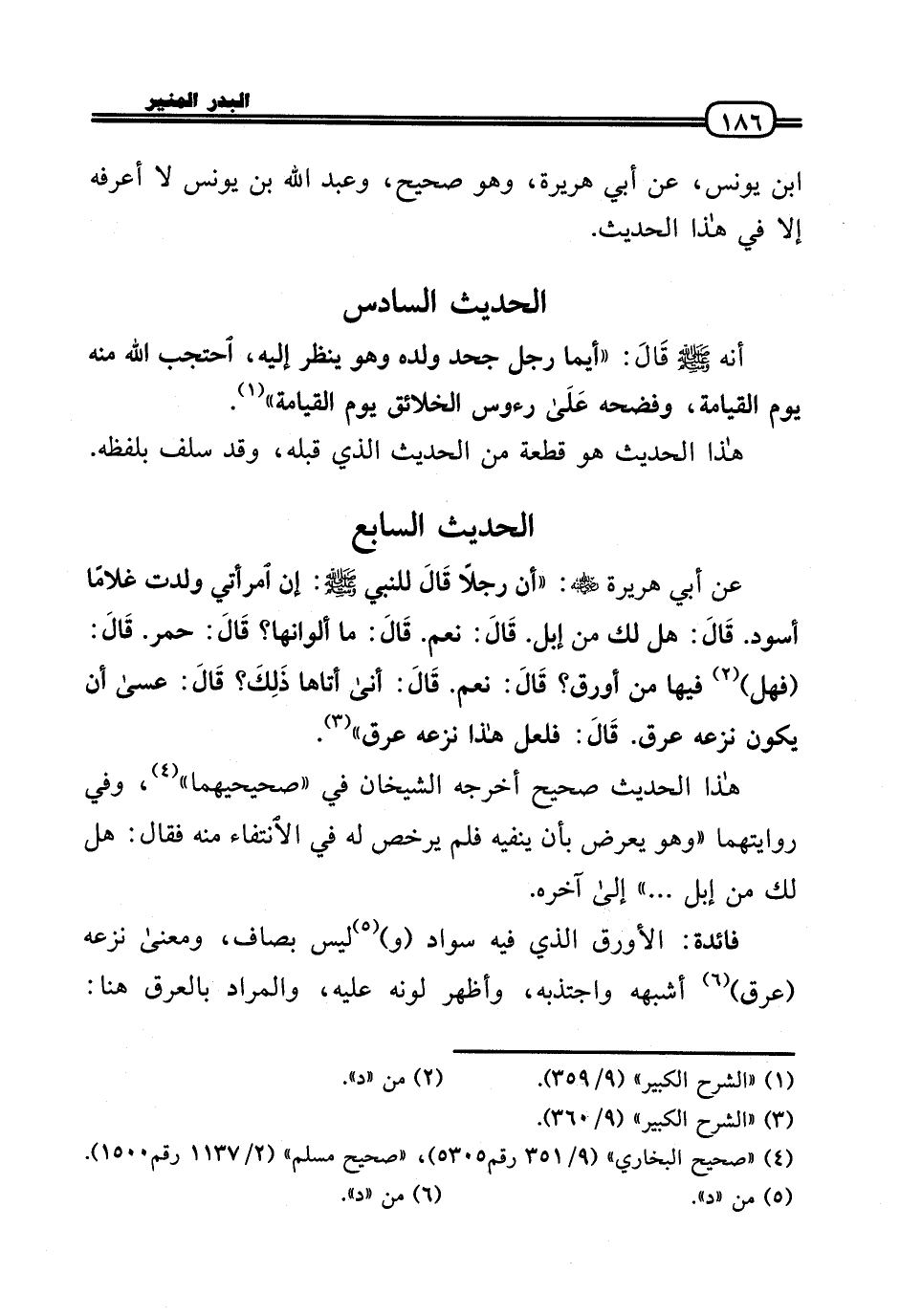 هَذَا الحَدِيث صَحِيح أخرجه الشَّيْخَانِ فِي «صَحِيحَيْهِمَا» ، وَفِي روايتهما «وَهُوَ يعرض بِأَن يَنْفِيه فَلم يرخص لَهُ فِي الانتفاء مِنْهُ فَقَالَ: هَل لَك من إبل ... » إِلَى آخِره.