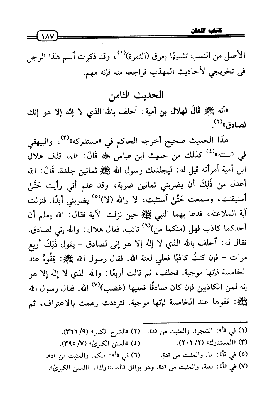 هَذَا الحَدِيث صَحِيح أخرجه الْحَاكِم فِي «مُسْتَدْركه» ، وَالْبَيْهَقِيّ فِي «سنَنه» كَذَلِك من حَدِيث ابْن عَبَّاس رَضي اللهُ عَنهُ قَالَ: «لما قذف هِلَال بن أُميَّة امْرَأَته قيل لَهُ: ليجلدنك رَسُول الله - صَلَّى الله عَلَيْهِ وَسلم - ثَمَانِينَ جلدَة. قَالَ: الله أعدل من ذَلِكَ أَن يضربني ثَمَانِينَ ضَرْبَة، وَقد علم أَنِّي رَأَيْت حَتَّى استيقنت، وَسمعت حَتَّى استثبت، لَا وَالله (لَا) يضربني أبدا. فَنزلت آيَة الْمُلَاعنَة، فَدَعَا بهما النَّبِي - صَلَّى الله عَلَيْهِ وَسلم - حِين نزلت الْآيَة فَقَالَ: الله يعلم أَن أَحَدكُمَا كَاذِب فَهَل (مِنْكُمَا من) تائب. فَقَالَ هِلَال: وَالله إِنِّي لصَادِق. فَقَالَ لَهُ: احْلِف بِاللَّه الَّذِي لَا إِلَه إِلَّا هُوَ إِنِّي لصَادِق - يَقُول ذَلِكَ أَربع مَرَّات - فَإِن كنتُ كَاذِبًا فعلي لعنة الله. فَقَالَ رَسُول الله - صَلَّى الله عَلَيْهِ وَسلم -: قِفُوهُ عِنْد الْخَامِسَة فَإِنَّهَا مُوجبَة. فَحلف، ثمَّ قَالَت أَرْبعا: وَالله الَّذِي لَا إِلَه إِلَّا هُوَ إِنَّه لمن الْكَاذِبين فَإِن كَانَ صَادِقا فعلَيْهَا (غضب) الله. فَقَالَ رَسُول الله - صَلَّى الله عَلَيْهِ وَسلم -: قفوها عِنْد الْخَامِسَة فَإِنَّهَا مُوجبَة. فترددت وهمت بالاعتراف، ثمَّ