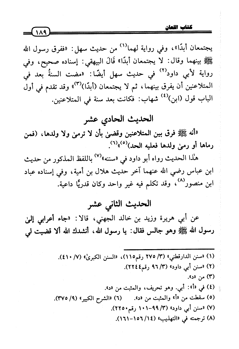 يَجْتَمِعَانِ أبدا» ، وَفِي رِوَايَة لَهما من حَدِيث سهل: «فَفرق رَسُول الله - صَلَّى الله عَلَيْهِ وَسلم - بَينهمَا وَقَالَ: لَا يَجْتَمِعَانِ أبدا» قَالَ الْبَيْهَقِيّ: إِسْنَاده صَحِيح، وَفِي رِوَايَة لأبي دَاوُد فِي حَدِيث سهل أَيْضا: «مَضَت السنةُ بعد فِي المتلاعنين أَن يفرق بَينهمَا، ثمَّ لَا يَجْتَمِعَانِ (أبدا) » وَقد تقدم فِي أول الْبَاب قَول (ابْن) شهَاب: فَكَانَت بعد سنة فِي المتلاعنين.