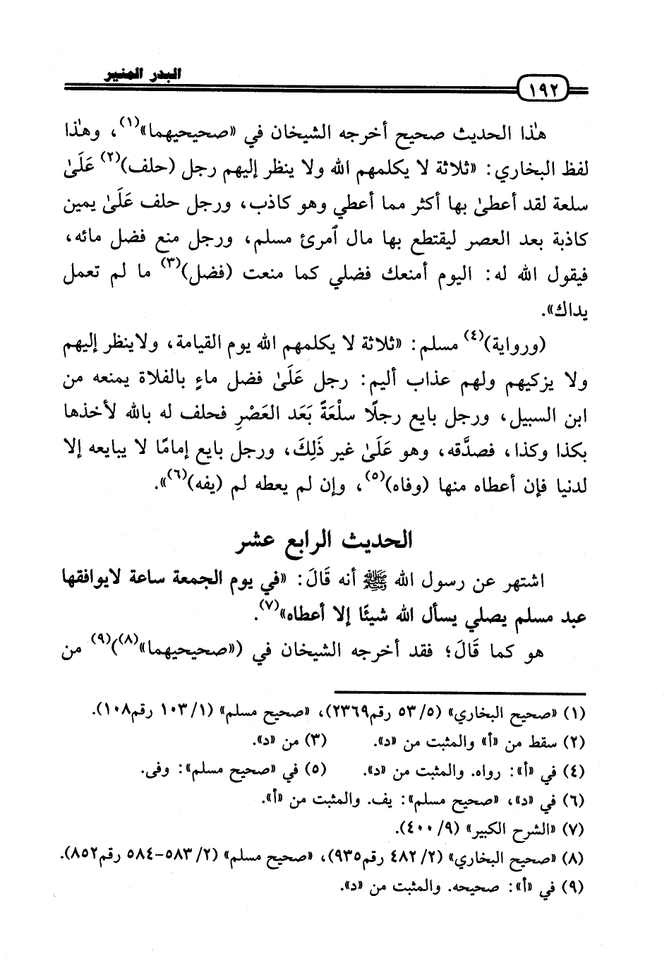 هَذَا الحَدِيث صَحِيح أخرجه الشَّيْخَانِ فِي «صَحِيحَيْهِمَا» ، وَهَذَا لفظ البُخَارِيّ: «ثَلَاثَة لَا يكلمهم الله وَلَا ينظر إِلَيْهِم رجل (حلف) عَلَى سلْعَة لقد أعْطى بهَا أَكثر مِمَّا أعطي وَهُوَ كَاذِب، وَرجل حلف عَلَى يَمِين كَاذِبَة بعد الْعَصْر ليقتطع بهَا مَال امْرِئ مُسلم، وَرجل منع فضل مَائه، فَيَقُول الله لَهُ: الْيَوْم أمنعك فضلي كَمَا منعت (فضل) مَا لم تعْمل يداك» .
