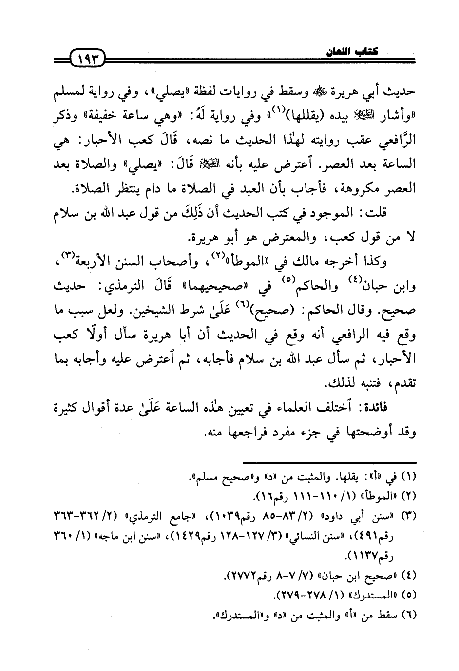 وَكَذَا أخرجه مَالك فِي «الْمُوَطَّأ» ، وَأَصْحَاب السّنَن الْأَرْبَعَة، وَابْن حبَان وَالْحَاكِم فِي «صَحِيحَيْهِمَا» قَالَ التِّرْمِذِيّ: حَدِيث صَحِيح. وَقَالَ الْحَاكِم: (صَحِيح) عَلَى شَرط الشَّيْخَيْنِ. وَلَعَلَّ سَبَب مَا وَقع فِيهِ الرَّافِعِيّ أَنه وَقع فِي الحَدِيث أَن أَبَا هُرَيْرَة سَأَلَ أَولا كَعْب الْأَحْبَار، ثمَّ سَأَلَ عبد الله بن سَلام فَأَجَابَهُ، ثمَّ اعْترض عَلَيْهِ وأجابه بِمَا تقدم، فَتنبه لذَلِك.