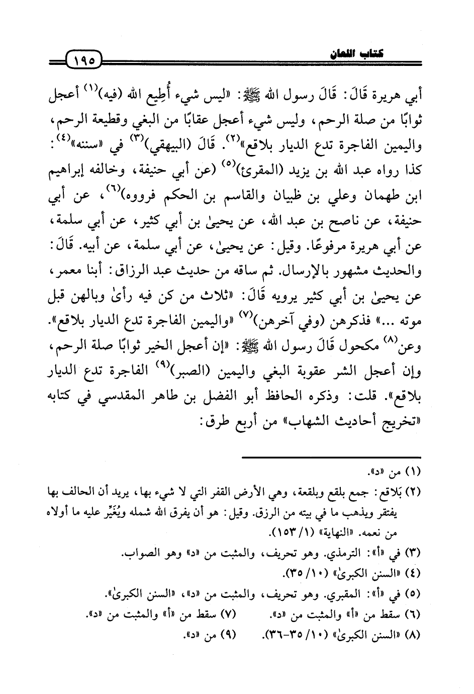 أبي هُرَيْرَة قَالَ: قَالَ رَسُول الله - صَلَّى الله عَلَيْهِ وَسلم -: «لَيْسَ شَيْء أُطِيع الله (فِيهِ) أعجل ثَوابًا من صلَة الرَّحِم، وَلَيْسَ شَيْء أعجل عقَابا من الْبَغي وَقَطِيعَة الرَّحِم، وَالْيَمِين الْفَاجِرَة تدع الديار بَلَاقِع» . قَالَ (الْبَيْهَقِيّ) فِي «سنَنه» : كَذَا رَوَاهُ عبد الله بن يزِيد (الْمُقْرِئ) (عَن أبي حنيفَة، وَخَالفهُ إِبْرَاهِيم بن طهْمَان وَعلي بن ظبْيَان وَالقَاسِم بن الحكم فَرَوَوْه) ، عَن أبي حنيفَة، عَن نَاصح بن عبد الله، عَن يَحْيَى بن أبي كثير، عَن أبي سَلمَة، عَن أبي هُرَيْرَة مَرْفُوعا. وَقيل: عَن يَحْيَى، عَن أبي سَلمَة، عَن أَبِيه. قَالَ: والْحَدِيث مَشْهُور بِالْإِرْسَال. ثمَّ سَاقه من حَدِيث عبد الرَّزَّاق: أبنا معمر، عَن يَحْيَى بن أبي كثير يرويهِ قَالَ: «ثَلَاث من كن فِيهِ رَأَى وبالهن قبل مَوته ... » فَذَكرهنَّ (وَفِي آخِرهنَّ) «وَالْيَمِين الْفَاجِرَة تدع الديار بَلَاقِع» . وَعَن مَكْحُول قَالَ رَسُول الله - صَلَّى الله عَلَيْهِ وَسلم -: «إِن أعجل الْخَيْر ثَوابًا صلَة الرَّحِم، وَإِن أعجل الشَّرّ عُقُوبَة الْبَغي وَالْيَمِين (الصَّبْر) الْفَاجِرَة تدع الديار بَلَاقِع» . قلت: وَذكره الْحَافِظ أَبُو الْفضل بن طَاهِر الْمَقْدِسِي فِي كِتَابه «تَخْرِيج أَحَادِيث الشهَاب» من أَربع طرق: