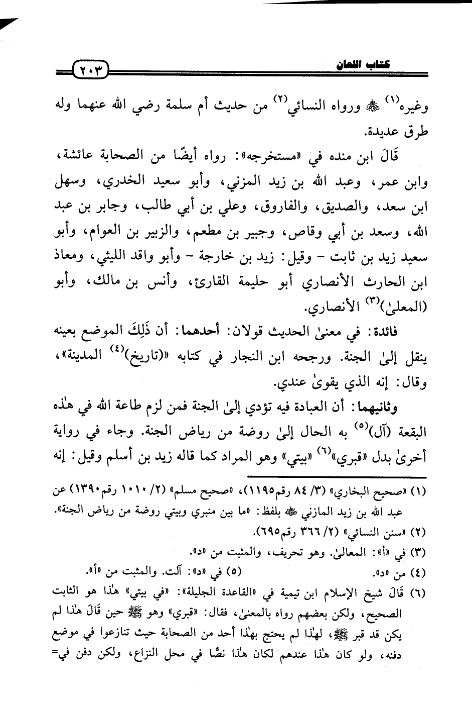 فَائِدَة: فِي مَعْنَى الحَدِيث قَولَانِ: أَحدهمَا: أَن ذَلِكَ الْموضع بِعَيْنِه ينْقل إِلَى الْجنَّة. وَرجحه ابْن النجار فِي كِتَابه « (تَارِيخ) الْمَدِينَة» ، وَقَالَ: إِنَّه الَّذِي يقوى عِنْدِي.