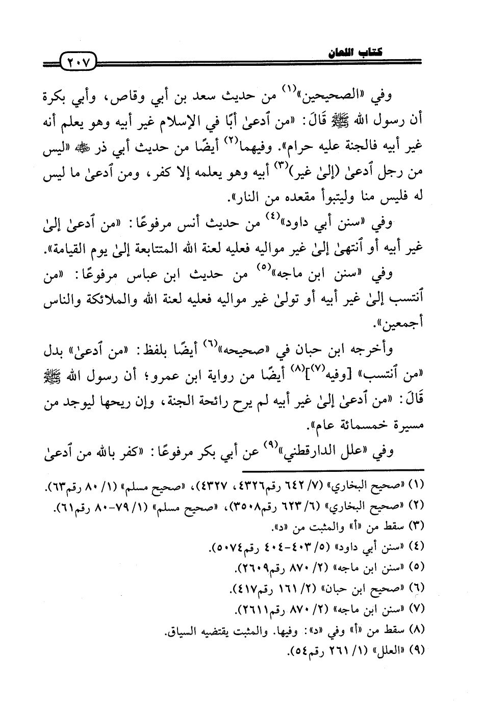 وَفِي «الصَّحِيحَيْنِ» من حَدِيث سعد بن أبي وَقاص، وَأبي بكرَة أَن رَسُول الله - صَلَّى الله عَلَيْهِ وَسلم - قَالَ: «من ادَّعَى أَبَا فِي الْإِسْلَام غير أَبِيه وَهُوَ يعلم أَنه غير أَبِيه فالجنة عَلَيْهِ حرَام» . وَفِيهِمَا أَيْضا من حَدِيث أبي ذَر رَضي اللهُ عَنهُ «لَيْسَ من رجل ادَّعَى (إِلَى غير) أَبِيه وَهُوَ يُعلمهُ إِلَّا كفر، وَمن ادَّعَى مَا لَيْسَ لَهُ فَلَيْسَ منا وليتبوأ مَقْعَده من النَّار» .