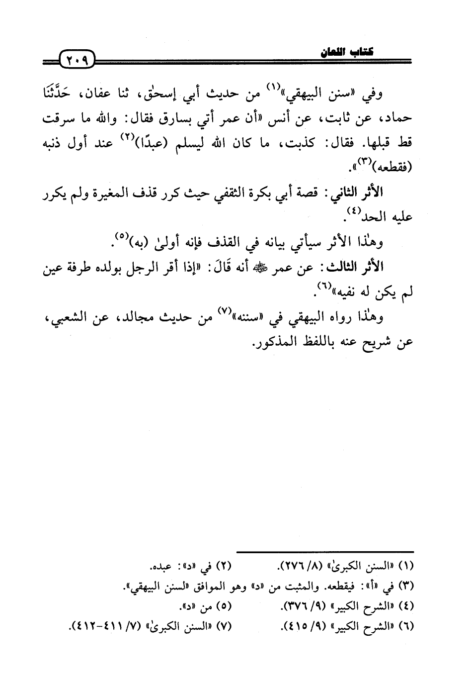 الْأَثر الثَّالِث: عَن عمر رَضي اللهُ عَنهُ أَنه قَالَ: «إِذا أقرّ الرجل بولده طرفَة عين لم يكن لَهُ نَفْيه» .