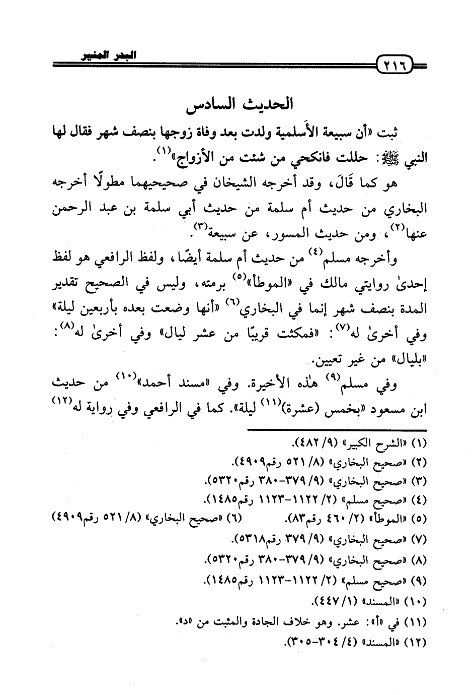 وَأخرجه مُسلم من حَدِيث أم سَلمَة أَيْضا، وَلَفظ الرَّافِعِيّ هُوَ لفظ إِحْدَى روايتي مَالك فِي «الْمُوَطَّأ» برمتِهِ، وَلَيْسَ فِي الصَّحِيح تَقْدِير الْمدَّة بِنصْف شهر إِنَّمَا فِي البُخَارِيّ (أَنَّهَا وضعت بعده بِأَرْبَعِينَ لَيْلَة) وَفِي أُخْرَى لَهُ: «فَمَكثت قَرِيبا من عشر لَيَال» وَفِي أُخْرَى لَهُ: «بِليَال) من غير تعْيين.