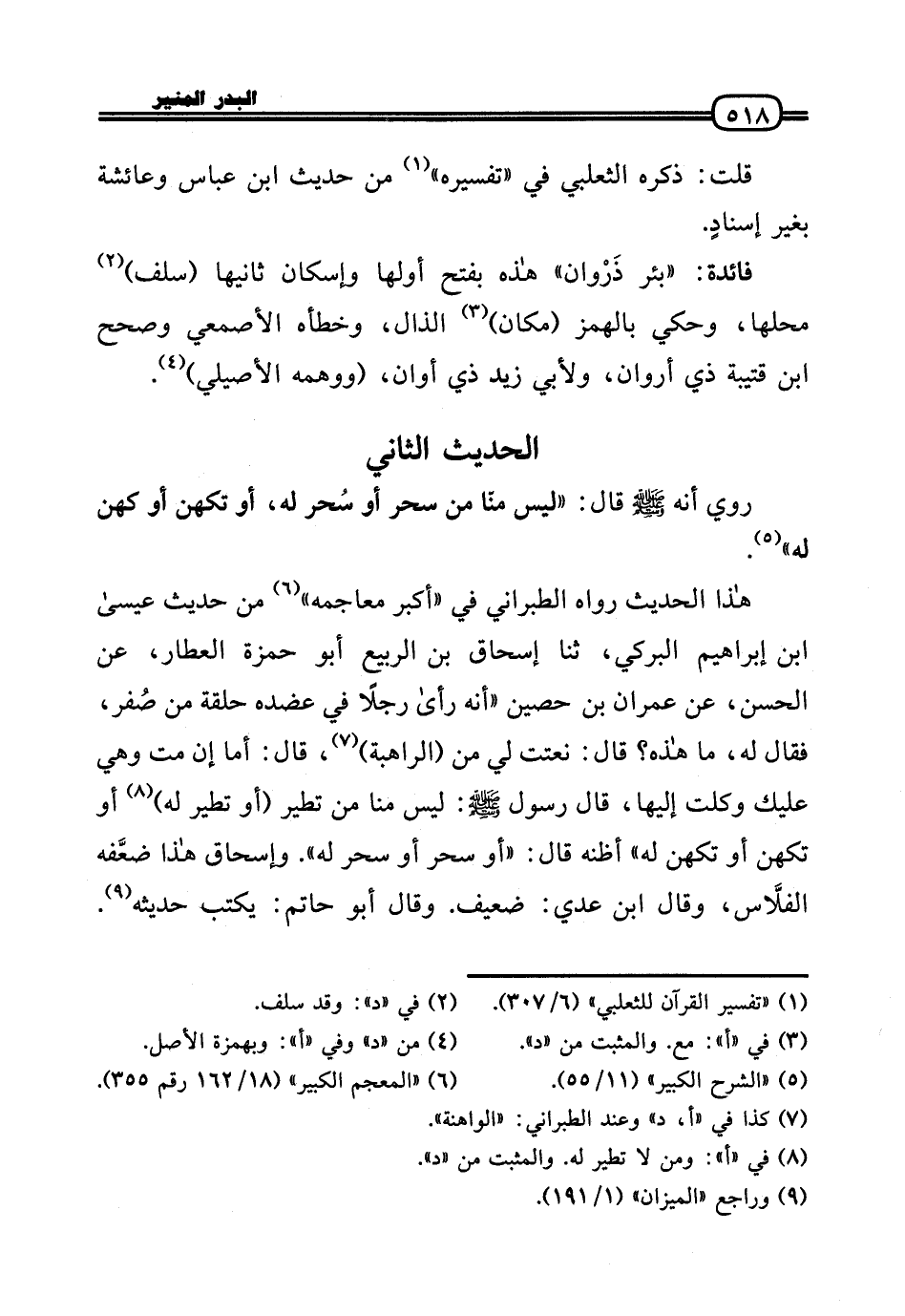 هَذَا الحَدِيث رَوَاهُ الطَّبَرَانِيّ فِي «أكبر معاجمه» من حَدِيث عِيسَى بن إِبْرَاهِيم البركي، ثَنَا إِسْحَاق بن الرّبيع أَبُو حَمْزَة الْعَطَّار، عَن الْحسن، عَن عمرَان بن حُصَيْن «أَنه رَأَى رجلا فِي عضده حَلقَة من صُفر، فَقَالَ لَهُ، مَا هَذِه؟ قَالَ: نعتت لي من (الراهبة) ، قَالَ: أما إِن مت وَهِي عَلَيْك وكلت إِلَيْهَا، قَالَ رَسُول (: لَيْسَ منا من تطير (أَو تطير لَهُ) أَو تكهن أَو تكهن لَهُ» أَظُنهُ قَالَ: «أَو سحر أَو سحر لَهُ» . وَإِسْحَاق هَذَا ضعَّفه الفلاَّس، وَقَالَ ابْن عدي: ضَعِيف. وَقَالَ أَبُو حَاتِم: يكْتب حَدِيثه.