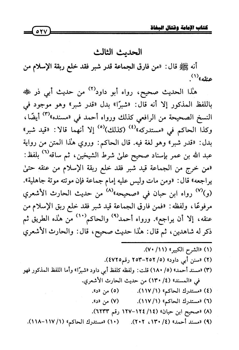 هَذَا الحَدِيث صَحِيح، رَوَاهُ أَبُو دَاوُد من حَدِيث أبي ذَر رَضِيَ اللَّهُ عَنْه بِاللَّفْظِ الْمَذْكُور إِلَّا أَنه قَالَ: «شبْرًا» بدل «قدر شبر» وَهُوَ مَوْجُود فِي النّسخ الصَّحِيحَة من الرَّافِعِيّ كَذَلِك وَرَوَاهُ أَحْمد فِي «مُسْنده» أَيْضا، وَكَذَا الْحَاكِم فِي «مُسْتَدْركه» (كَذَلِك) إِلَّا أَنَّهُمَا قَالَا: «قيد شبر» بدل: «قدر شبر» وَهُوَ لُغَة فِيهِ. قَالَ الْحَاكِم: وَرُوِيَ هَذَا الْمَتْن من رِوَايَة عبد الله بن عمر بِإِسْنَاد صَحِيح عَلَى شَرط الشَّيْخَيْنِ، ثمَّ سَاقه بِلَفْظ: «من خرج من الْجَمَاعَة قيد شبر فقد خلع ربقة الْإِسْلَام من عُنُقه حَتَّى يُرَاجِعهُ» قَالَ: «وَمن مَاتَ وَلَيْسَ عَلَيْهِ إِمَام جمَاعَة فَإِن موتته موتَة جَاهِلِيَّة» . (و) رَوَاهُ ابْن حبَان فِي «صَحِيحه» من حَدِيث الْحَارِث الْأَشْعَرِيّ مَرْفُوعا، وَلَفظه: «فَمن فَارق الْجَمَاعَة قيد شبر فقد خلع ربق الْإِسْلَام من عُنُقه، إِلَّا أَن يُرَاجع» . وَرَوَاهُ أَحْمد وَالْحَاكِم من هَذِه الطَّرِيق ثمَّ ذكر لَهُ شَاهِدين، ثمَّ قَالَ: هَذَا حَدِيث صَحِيح، قَالَ: والْحَارث الْأَشْعَرِيّ