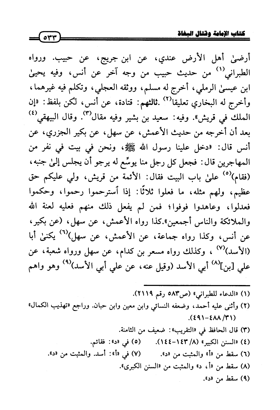 أَرْضَى أهل الأَرْض عِنْدِي، عَن ابْن جريج، عَن حبيب. وَرَوَاهُ الطَّبَرَانِيّ من حَدِيث حبيب من وَجه آخر عَن أنس، وَفِيه يَحْيَى بن عِيسَى الرَّمْلِيّ، أخرج لَهُ مُسلم، وَوَثَّقَهُ الْعجلِيّ، وَتكلم فِيهِ غَيرهمَا، وَأخرج لَهُ البُخَارِيّ تَعْلِيقا. ثالثهم: قَتَادَة، عَن أنس، لَكِن بِلَفْظ: «إِن الْملك فِي قُرَيْش» . وَفِيه: سعيد بن بشير وَفِيه مقَال. وَقَالَ الْبَيْهَقِيّ بعد أَن أخرجه من حَدِيث الْأَعْمَش، عَن سهل، عَن بكير الْجَزرِي، عَن أنس قَالَ: «دخل علينا رَسُول الله - صَلَّى الله عَلَيْهِ وَسلم -، وَنحن فِي بَيت فِي نفر من الْمُهَاجِرين قَالَ: فَجعل كل رجل منا يوسِّع لَهُ يَرْجُو أَن يجلس إِلَى جنبه، (فَقَامَ) عَلَى بَاب الْبَيْت فَقَالَ: الْأَئِمَّة من قُرَيْش، ولي عَلَيْكُم حق عَظِيم، وَلَهُم مثله، مَا فعلوا ثَلَاثًا: إِذا استرحموا رحموا، وحكموا فعدلوا، وعاهدوا فوفوا؛ فَمن لم يفعل ذَلِك مِنْهُم فَعَلَيهِ لعنة الله وَالْمَلَائِكَة وَالنَّاس أَجْمَعِينَ» . كَذَا رَوَاهُ الْأَعْمَش، عَن سهل، (عَن بكير، عَن أنس، وَكَذَا رَوَاهُ جمَاعَة، عَن الْأَعْمَش، عَن سهل) يكنى أَبَا (الْأسد) ، وَكَذَلِكَ رَوَاهُ مسعر بن كدام، عَن سهل وَرَوَاهُ شُعْبَة، عَن عَلّي [بن] أبي الْأسد (وَقيل عَنهُ، عَن عَلّي أبي الْأسد) وَهُوَ واهم
