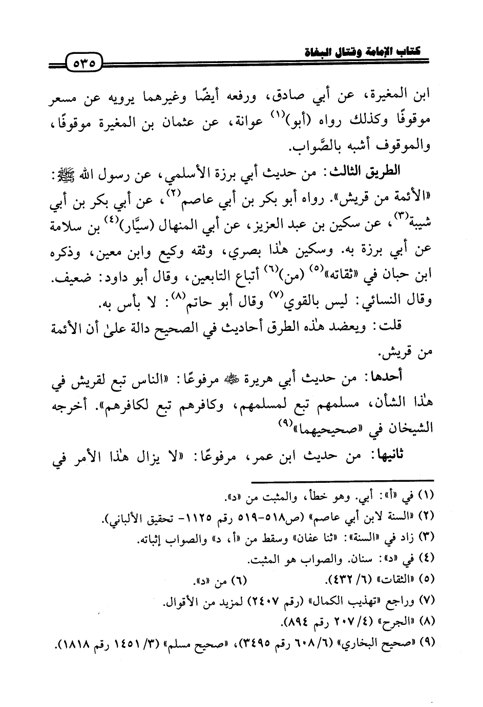 الطَّرِيق الثَّالِث: من حَدِيث أبي بَرزَة الْأَسْلَمِيّ، عَن رَسُول الله - صَلَّى الله عَلَيْهِ وَسلم -: «الْأَئِمَّة من قُرَيْش» . رَوَاهُ أَبُو بكر بن أبي عَاصِم، عَن أبي بكر بن أبي شيبَة، عَن سكين بن عبد الْعَزِيز، عَن أبي الْمنْهَال (سيَّار) بن سَلامَة عَن أبي بَرزَة بِهِ. وسكين هَذَا بَصرِي، وَثَّقَهُ وَكِيع وَابْن معِين، وَذكره ابْن حبَان فِي «ثقاته» (من) أَتبَاع التَّابِعين، وَقَالَ أَبُو دَاوُد: ضَعِيف. وَقَالَ النَّسَائِيّ: لَيْسَ بِالْقَوِيّ وَقَالَ أَبُو حَاتِم: لَا بَأْس بِهِ.
