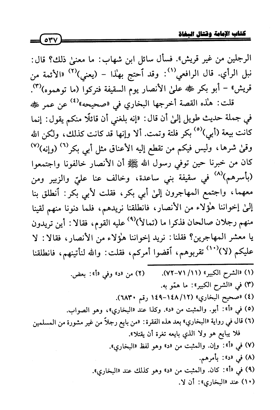 الرجلَيْن من غير قُرَيْش» . فَسَأَلَ سَائل ابْن شهَاب: مَا مَعْنَى ذَلِك؟ قَالَ: نبل الرَّأْي. قَالَ الرَّافِعِيّ: وَقد احْتج بِهَذَا - (يَعْنِي) «الْأَئِمَّة من قُرَيْش» - أَبُو بكر رَضِيَ اللَّهُ عَنْه عَلَى الْأَنْصَار يَوْم السَّقِيفَة فتركوا (مَا توهموه) .
