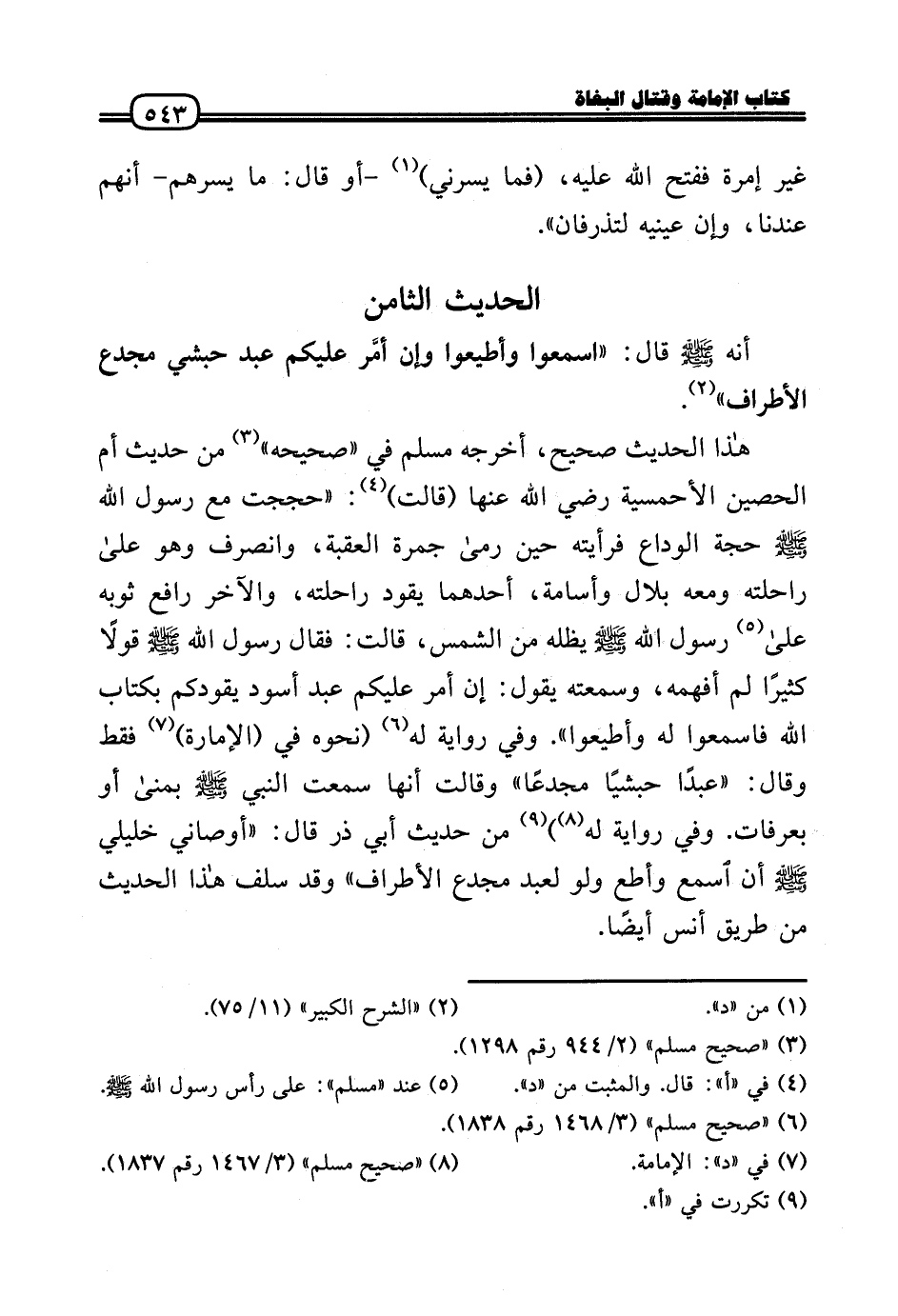 أنَّه - صَلَّى الله عَلَيْهِ وَسلم - قَالَ: «اسمعوا وَأَطيعُوا وَإِن أمَّر عَلَيْكُم عبد حبشِي مجدع الْأَطْرَاف» .