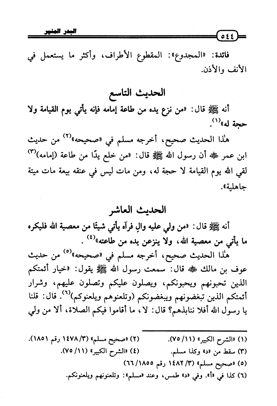 أنَّه - صَلَّى الله عَلَيْهِ وَسلم - قَالَ: «من نزع يَده من طَاعَة إِمَامه فَإِنَّهُ يَأْتِي يَوْم الْقِيَامَة وَلَا حجَّة لَهُ» .