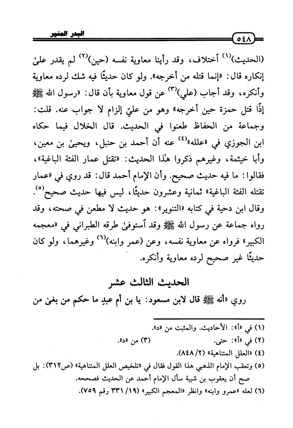 (الحَدِيث) اخْتِلَاف، وَقد رَأينَا مُعَاوِيَة نَفسه (حِين) لم يقدر عَلَى إِنْكَاره قَالَ: «إِنَّمَا قَتله من أخرجه» . وَلَو كَانَ حَدِيثا فِيهِ شكّ لرده مُعَاوِيَة وَأنْكرهُ، وَقد أجَاب (عَلّي) عَن قَول مُعَاوِيَة بِأَن قَالَ: «رَسُول الله - صَلَّى الله عَلَيْهِ وَسلم - إِذا قتل حَمْزَة حِين أخرجه» وَهُوَ من عليّ إِلْزَام لَا جَوَاب عَنهُ. قلت: وَجَمَاعَة من الْحفاظ طعنوا فِي الحَدِيث. قَالَ الْخلال فِيمَا حَكَاهُ ابْن الْجَوْزِيّ فِي «علله» عَنهُ أَن أَحْمد بن حَنْبَل، وَيَحْيَى بن معِين، وَأَبا خَيْثَمَة، وَغَيرهم ذكرُوا هَذَا الحَدِيث: «تقتل عمار الفئة الباغية» ، فَقَالُوا: مَا فِيهِ حَدِيث صَحِيح. وَأَن الإِمَام أَحْمد قَالَ: قد رُوِيَ فِي «عمار تقتله الفئة الباغية» ثَمَانِيَة وَعِشْرُونَ حَدِيثا، لَيْسَ فِيهَا حَدِيث صَحِيح. وَقَالَ ابْن دحْيَة فِي كِتَابه «التَّنْوِير» : هُوَ حَدِيث لَا مطْعن فِي صِحَّته، وَقد رَوَاهُ جمَاعَة عَن رَسُول الله - صَلَّى الله عَلَيْهِ وَسلم - وَقد اسْتَوْفَى طرقه الطَّبَرَانِيّ فِي «مُعْجَمه الْكَبِير» فَرَوَاهُ عَن مُعَاوِيَة نَفسه، وَعَن (عمر وَابْنه) وَغَيرهمَا، وَلَو كَانَ حَدِيثا غير صَحِيح لرده مُعَاوِيَة وَأنْكرهُ.