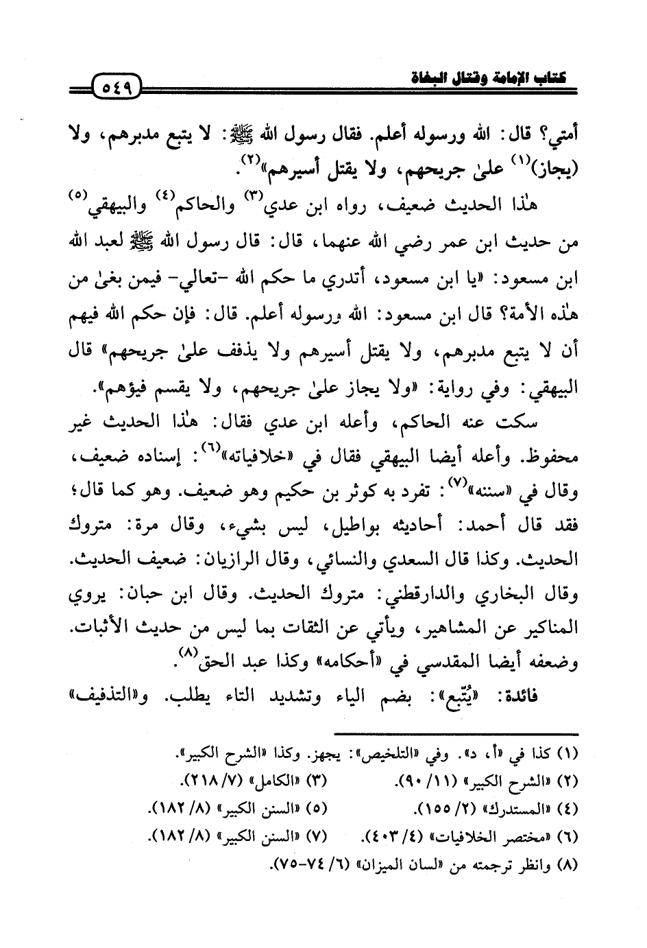 هَذَا الحَدِيث ضَعِيف، رَوَاهُ ابْن عدي وَالْحَاكِم وَالْبَيْهَقِيّ من حَدِيث ابْن عمر رَضِيَ اللَّهُ عَنْهما، قَالَ: قَالَ رَسُول الله - صَلَّى الله عَلَيْهِ وَسلم - لعبد الله ابْن مَسْعُود: «يَا ابْن مَسْعُود، أَتَدْرِي مَا حكم الله - تعالي - فِيمَن بغى من هَذِه الْأمة؟ قَالَ ابْن مَسْعُود: الله وَرَسُوله أعلم. قَالَ: فَإِن حكم الله فيهم أَن لَا يتبع مدبرهم، وَلَا يقتل أسيرهم وَلَا يذفف عَلَى جريحهم» قَالَ الْبَيْهَقِيّ: وَفِي رِوَايَة: «وَلَا يجاز عَلَى جريحهم، وَلَا يقسم فيؤهم» .