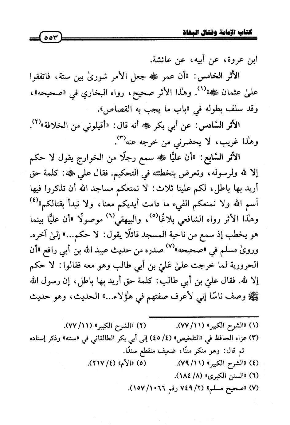 الْأَثر السَّابع: «أَن عليًّا رَضِيَ اللَّهُ عَنْه سمع رجلا من الْخَوَارِج يَقُول لَا حكم إِلَّا لله وَلِرَسُولِهِ، وَتعرض بتخطئته فِي التَّحْكِيم. فَقَالَ عَلّي رَضِيَ اللَّهُ عَنْه: كلمة حق أُرِيد بهَا بَاطِل، لكم علينا ثَلَاث: لَا نمنعكم مَسَاجِد الله أَن تَذكرُوا فِيهَا اسْم الله وَلَا نمنعكم الْفَيْء مَا دَامَت أَيْدِيكُم مَعنا، وَلَا نبدأ بقتالكم» وَهَذَا الْأَثر رَوَاهُ الشَّافِعِي بلاغًا، وَالْبَيْهَقِيّ مَوْصُولا «أَن عليًّا بَيْنَمَا هُوَ يخْطب إِذْ سمع من نَاحيَة الْمَسْجِد قَائِلا يَقُول: لَا حكم ... » إِلَى آخِره. وَرَوَى مُسلم فِي «صَحِيحه» صَدره من حَدِيث عبيد الله بن أبي رَافع «أَن الحرورية لما خرجت عَلَى عَليّ بن أبي طَالب وَهُوَ مَعَه فَقَالُوا: لَا حكم إِلَّا لله. فَقَالَ عليّ بن أبي طَالب: كلمة حق أُرِيد بهَا بَاطِل، إِن رَسُول الله - صَلَّى الله عَلَيْهِ وَسلم - وصف نَاسا إِنِّي لأعرف صفتهمْ فِي هَؤُلَاءِ ... » الحَدِيث، وَهُوَ حَدِيث