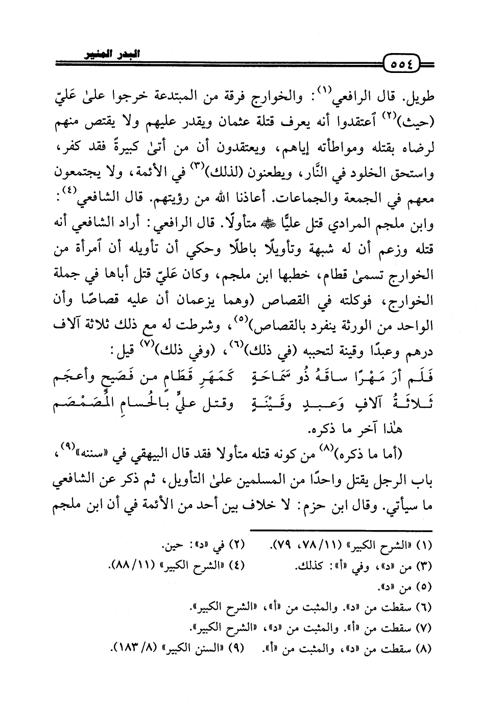 طَوِيل. قَالَ الرَّافِعِيّ: والخوارج فرقة من المبتدعة خَرجُوا عَلَى عَليّ (حَيْثُ) اعتقدوا أَنه يعرف قتلة عُثْمَان وَيقدر عَلَيْهِم وَلَا يقْتَصّ مِنْهُم لرضاه بقتْله ومواطأته إيَّاهُم، ويعتقدون أَن من أَتَى كَبِيرَة فقد كفر، وَاسْتحق الخلود فِي النَّار، ويطعنون (لذَلِك) فِي الْأَئِمَّة، وَلَا يَجْتَمعُونَ مَعَهم فِي الْجُمُعَة وَالْجَمَاعَات. أعاذنا الله من رُؤْيَتهمْ. قَالَ الشَّافِعِي: وَابْن ملجم الْمرَادِي قتل عليًّا رَضِيَ اللَّهُ عَنْه متأولاً. قَالَ الرَّافِعِيّ: أَرَادَ الشَّافِعِي أَنه قَتله وَزعم أَن لَهُ شُبْهَة وتأويلاً بَاطِلا وَحكي أَن تَأْوِيله أَن امْرَأَة من الْخَوَارِج تسمى قطام، خطبهَا ابْن ملجم، وَكَانَ عَليّ قتل أَبَاهَا فِي جملَة الْخَوَارِج، فَوَكَّلَتْهُ فِي الْقصاص (وهما يزعمان أَن عَلَيْهِ قصاصا وَأَن الْوَاحِد من الْوَرَثَة ينْفَرد بِالْقصاصِ) ، وشرطت لَهُ مَعَ ذَلِك ثَلَاثَة آلَاف دِرْهَم وعبدًا وقينة لتحببه (فِي ذَلِك) ، (وَفِي ذَلِك) قيل: