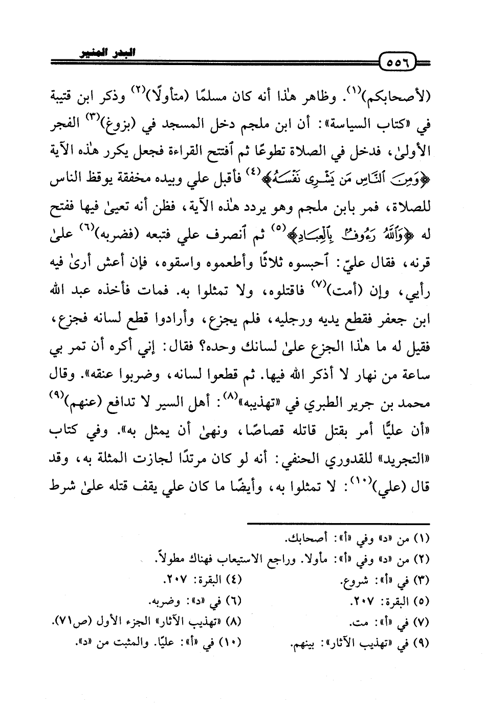 (لأصحابكم) . وَظَاهر هَذَا أَنه كَانَ مُسلما (متأولاً) وَذكر ابْن قُتَيْبَة فِي «كتاب السياسة» : أَن ابْن ملجم دخل الْمَسْجِد فِي (بزوغ) الْفجْر الأولَى، فَدخل فِي الصَّلَاة تَطَوّعا ثمَّ افْتتح الْقِرَاءَة فَجعل يُكَرر هَذِه الْآيَة (وَمن النَّاس من يشري نَفسه) فَأقبل عَلّي وَبِيَدِهِ مخفقة يوقظ النَّاس للصَّلَاة، فَمر بِابْن ملجم وَهُوَ يردد هَذِه الْآيَة، فَظن أَنه تعيى فِيهَا فَفتح لَهُ (وَالله رؤوف بالعباد) ثمَّ انْصَرف عَلّي فَتَبِعَهُ (فَضَربهُ) عَلَى قرنه، فَقَالَ عليّ: احْبِسُوهُ ثَلَاثًا وأطعموه واسقوه، فَإِن أعش أرَى فِيهِ رَأْيِي، وَإِن (أمت) فَاقْتُلُوهُ، وَلَا تمثلوا بِهِ. فَمَاتَ فَأَخذه عبد الله بن جَعْفَر فَقطع يَدَيْهِ وَرجلَيْهِ، فَلم يجزع، وَأَرَادُوا قطع لِسَانه فجزع، فَقيل لَهُ مَا هَذَا الْجزع عَلَى لسَانك وَحده؟ فَقَالَ: إِنِّي أكره أَن تمر بِي سَاعَة من نَهَار لَا أذكر الله فِيهَا. ثمَّ قطعُوا لِسَانه، وضربوا عُنُقه» . وَقَالَ مُحَمَّد بن جرير الطَّبَرِيّ فِي «تهذيبه» : أهل السّير لَا تدافع (عَنْهُم) «أَن عليًّا أَمر بقتل قَاتله قصاصا، وَنَهَى أَن يمثل بِهِ» . وَفِي كتاب «التَّجْرِيد» للقدوري الْحَنَفِيّ: أَنه لَو كَانَ مُرْتَدا لجازت الْمثلَة بِهِ، وَقد قَالَ (عَلّي) : لَا تمثلوا بِهِ، وَأَيْضًا مَا كَانَ عَلّي يقف قَتله عَلَى شَرط