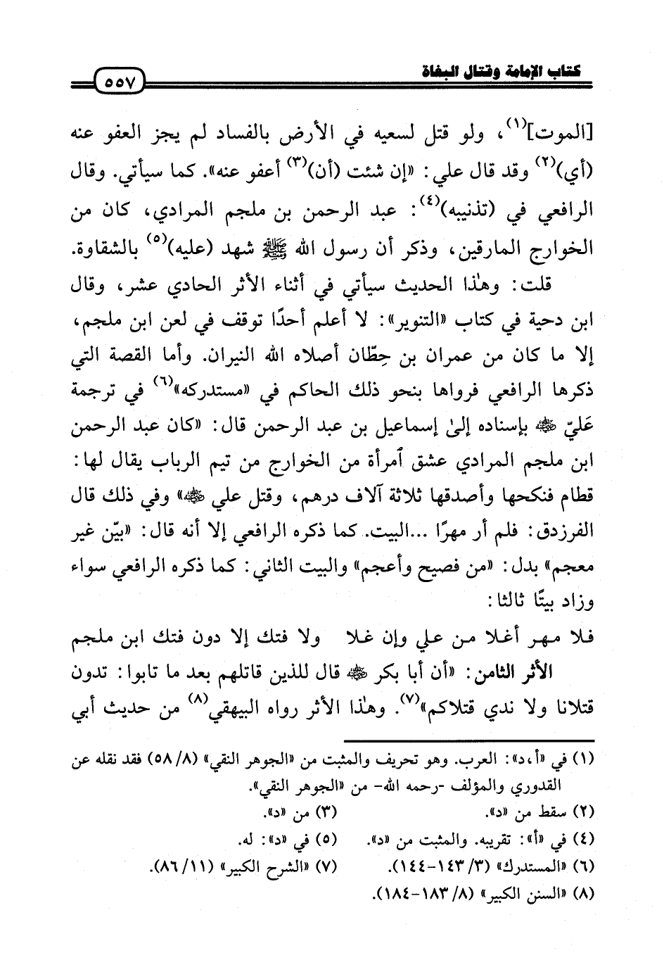 [الْمَوْت] ، وَلَو قتل لسعيه فِي الأَرْض بِالْفَسَادِ لم يجز الْعَفو عَنهُ (أَي) وَقد قَالَ عَلّي: «إِن شِئْت (أَن) أعفو عَنهُ» . كَمَا سَيَأْتِي. وَقَالَ الرَّافِعِيّ فِي (تذنيبه) : عبد الرَّحْمَن بن ملجم الْمرَادِي، كَانَ من الْخَوَارِج المارقين، وَذكر أَن رَسُول الله - صَلَّى الله عَلَيْهِ وَسلم - شهد (عَلَيْهِ) بالشقاوة.