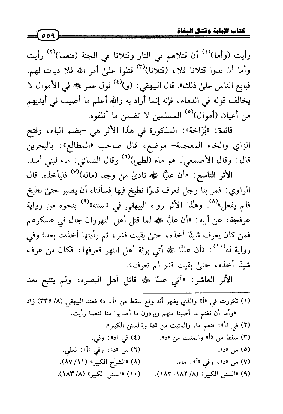 الْأَثر التَّاسِع: «أَن عليًّا رَضِيَ اللَّهُ عَنْه نَادَى من وجد (مَاله) فليأخذه. قَالَ الرَّاوِي: فَمر بِنَا رجل فَعرف قدرا نطبخ فِيهَا فَسَأَلْنَاهُ أَن يصبر حَتَّى نطبخ فَلم يفعل» . وَهَذَا الْأَثر رَوَاهُ الْبَيْهَقِيّ فِي «سنَنه» بِنَحْوِهِ من رِوَايَة عرْفجَة، عَن أَبِيه: (أَن عليًّا رَضِيَ اللَّهُ عَنْه لما قتل أهل النهروان جال فِي عَسْكَرهمْ فَمن كَانَ يعرف شَيْئا أَخذه، حَتَّى بقيت قدر، ثمَّ رَأَيْتهَا أخذت بعد» وَفِي رِوَايَة لَهُ: «أَن عليًّا رَضِيَ اللَّهُ عَنْه أُتِي برثة أهل النَّهر فعرفها، فَكَانَ من عرف شَيْئا أَخذه، حَتَّى بقيت قدر لم تعرف» .