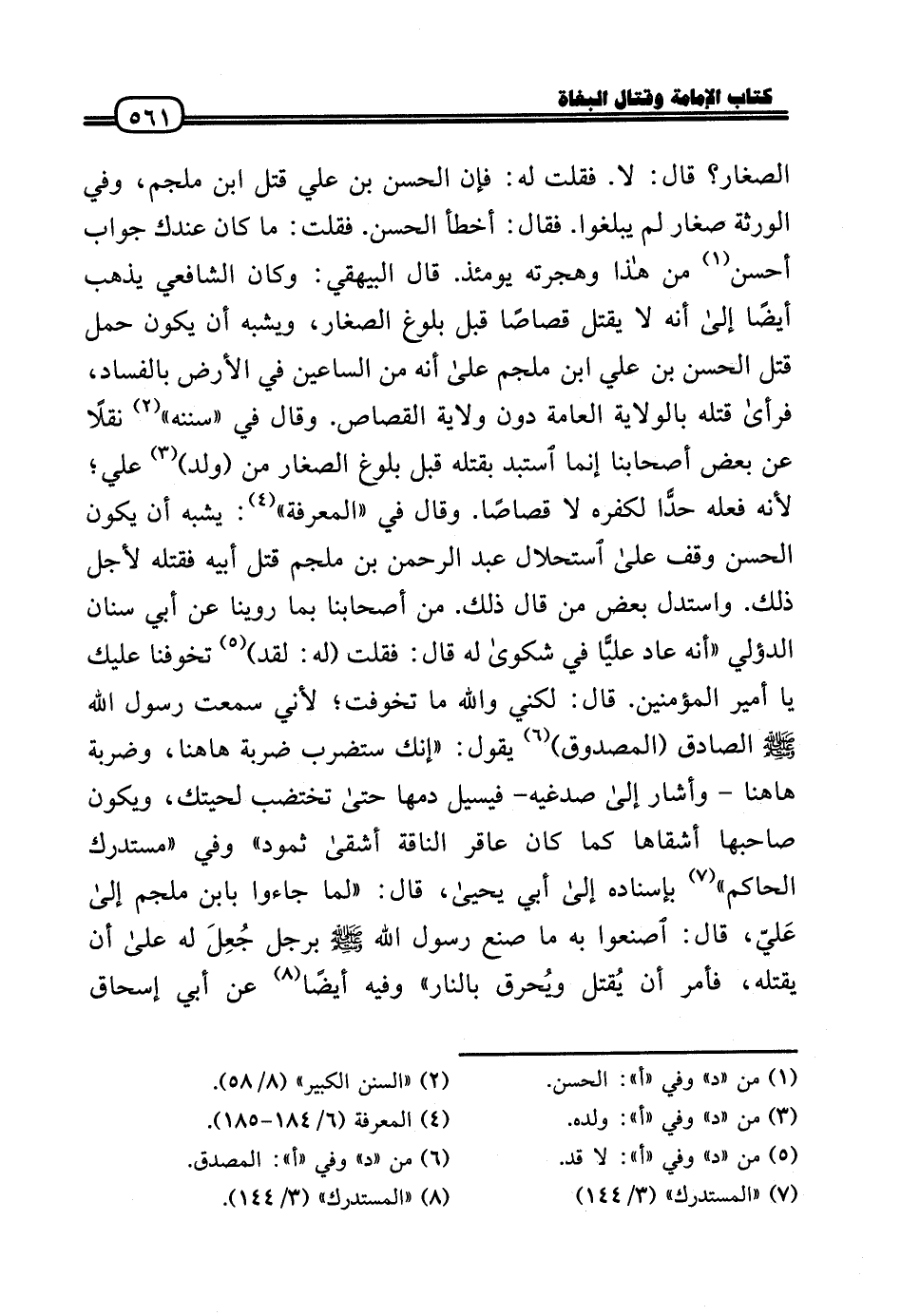 الصغار؟ قَالَ: لَا. فَقلت لَهُ: فَإِن الْحسن بن عَلّي قتل ابْن ملجم، وَفِي الْوَرَثَة صغَار لم يبلغُوا. فَقَالَ: أَخطَأ الْحسن. فَقلت: مَا كَانَ عنْدك جَوَاب أحسن من هَذَا وهجرته يَوْمئِذٍ. قَالَ الْبَيْهَقِيّ: وَكَانَ الشَّافِعِي يذهب أَيْضا إِلَى أَنه لَا يقتل قصاصا قبل بُلُوغ الصغار، وَيُشبه أَن يكون حمل قتل الْحسن بن عَلّي ابنَ ملجم عَلَى أَنه من الساعين فِي الأَرْض بِالْفَسَادِ، فَرَأَى قَتله بِالْولَايَةِ الْعَامَّة دون ولَايَة الْقصاص. وَقَالَ فِي «سنَنه» نقلا عَن بعض أَصْحَابنَا إِنَّمَا استبد بقتْله قبل بُلُوغ الصغار من (ولد) عَلّي؛ لِأَنَّهُ فعله حدًّا لكفره لَا قصاصا. وَقَالَ فِي «الْمعرفَة» يشبه أَن يكون الْحسن وقف عَلَى استحلال عبد الرَّحْمَن بن ملجم قتل أَبِيه فَقتله لأجل ذَلِك. وَاسْتدلَّ بعض من قَالَ ذَلِك. من أَصْحَابنَا بِمَا روينَا عَن أبي سِنَان الدؤَلِي «أَنه عَاد عليًّا فِي شكوى لَهُ قَالَ: فَقلت (لَهُ: لقد) تخوفنا عَلَيْك يَا أَمِير الْمُؤمنِينَ. قَالَ: لكني وَالله مَا تخوفت؛ لِأَنِّي سَمِعت رَسُول الله - صَلَّى الله عَلَيْهِ وَسلم - الصَّادِق (المصدوق) يَقُول: «إِنَّك ستضرب ضَرْبَة هَاهُنَا، وضربة هَاهُنَا - وَأَشَارَ إِلَى صدغيه - فيسيل دَمهَا حَتَّى تختضب لحيتك، وَيكون صَاحبهَا أشقاها كَمَا كَانَ عَاقِر النَّاقة أَشْقَى ثَمُود» وَفِي «مُسْتَدْرك الْحَاكِم» بِإِسْنَادِهِ إِلَى أبي يَحْيَى، قَالَ: «لما جَاءُوا بِابْن ملجم إِلَى عَليّ، قَالَ: اصنعوا بِهِ مَا صنع رَسُول الله - صَلَّى الله عَلَيْهِ وَسلم - بِرَجُل جُعِلَ لَهُ عَلَى أَن يقْتله، فَأمر أَن يُقتل ويُحرق بالنَّار» وَفِيه أَيْضا عَن أبي إِسْحَاق
