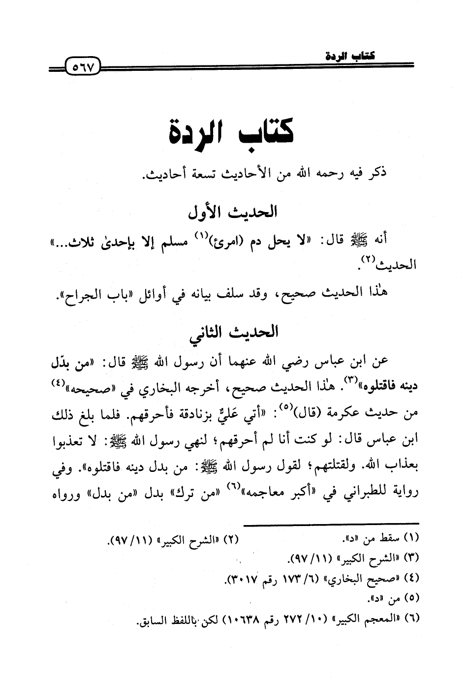 عَن ابْن عَبَّاس رَضِيَ اللَّهُ عَنْهما أَن رَسُول الله - صَلَّى الله عَلَيْهِ وَسلم - قَالَ: «من بدّل دينه فَاقْتُلُوهُ» . هَذَا الحَدِيث صَحِيح، أخرجه البُخَارِيّ فِي «صَحِيحه» من حَدِيث عِكْرِمَة (قَالَ) : «أُتِي عَليٌّ بزنادقة فأحرقهم. فَلَمَّا بلغ ذَلِك ابْن عَبَّاس قَالَ: لَو كنت أَنا لم أحرقهم؛ لنهي رَسُول الله - صَلَّى الله عَلَيْهِ وَسلم -: لَا تعذبوا بِعَذَاب الله. ولقتلتهم؛ لقَوْل رَسُول الله - صَلَّى الله عَلَيْهِ وَسلم -: من بدل دينه فَاقْتُلُوهُ» . وَفِي رِوَايَة للطبراني فِي «أكبر معاجمه» «من ترك» بدل «من بدل» وَرَوَاهُ