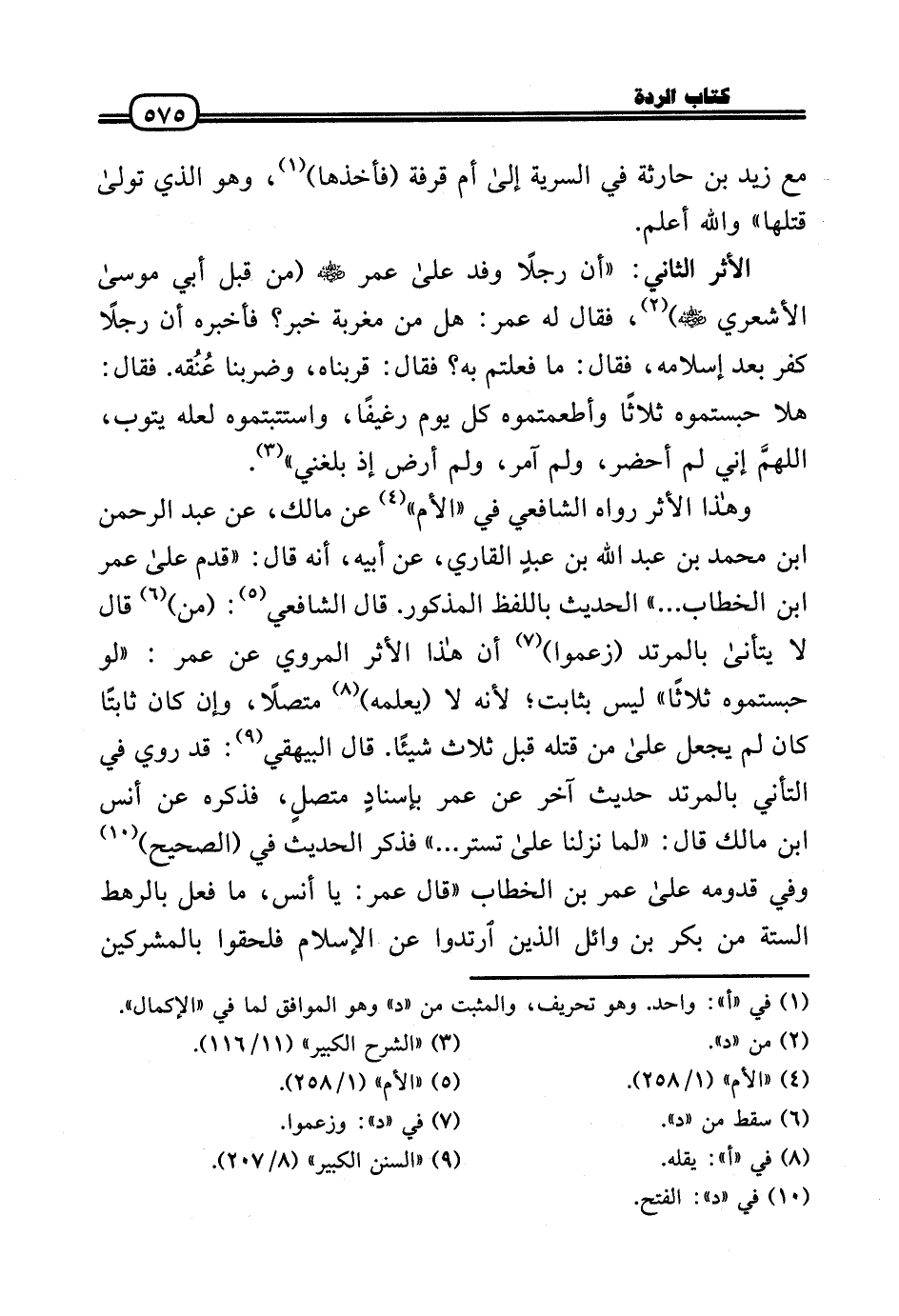 وَهَذَا الْأَثر رَوَاهُ الشَّافِعِي فِي «الْأُم» عَن مَالك، عَن عبد الرَّحْمَن بن مُحَمَّد بن عبد الله بن عبدٍ الْقَارِي، عَن أَبِيه، أَنه قَالَ: «قدم عَلَى عمر بن الْخطاب ... » الحَدِيث بِاللَّفْظِ الْمَذْكُور. قَالَ الشَّافِعِي: (من) قَالَ لَا يتأنى بالمرتد (زَعَمُوا) أَن هَذَا الْأَثر الْمَرْوِيّ عَن عمر: «لَو حبستموه ثَلَاثًا» لَيْسَ بِثَابِت؛ لِأَنَّهُ لَا (يُعلمهُ) مُتَّصِلا، وَإِن كَانَ ثَابتا كَانَ لم يَجْعَل عَلَى من قَتله قبل ثَلَاث شَيْئا. قَالَ الْبَيْهَقِيّ: قد رُوِيَ فِي التأني بالمرتد حَدِيث آخر عَن عمر بإسنادٍ متصلٍ، فَذكره عَن أنس بن مَالك قَالَ: «لما نزلنَا عَلَى تستر ... » فَذكر الحَدِيث فِي (الصَّحِيح) وَفِي قدومه عَلَى عمر بن الْخطاب «قَالَ عمر: يَا أنس، مَا فعل بالرهط السِّتَّة من بكر بن وَائِل الَّذين ارْتَدُّوا عَن الْإِسْلَام فَلَحقُوا بالمشركين